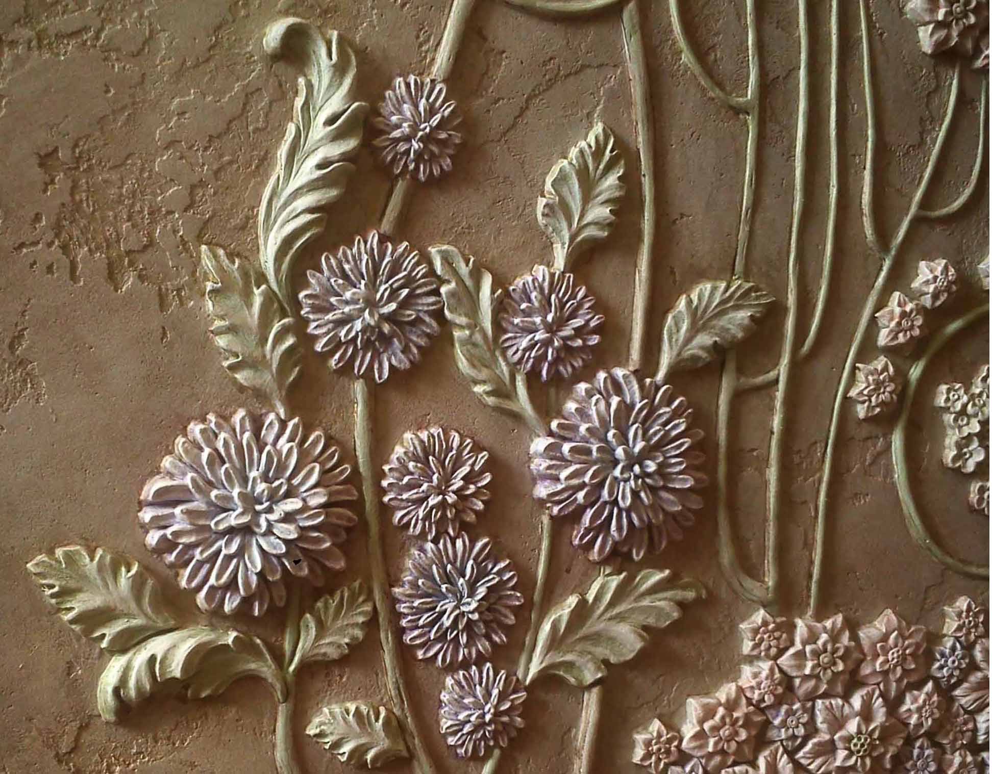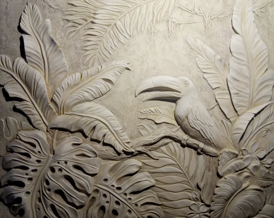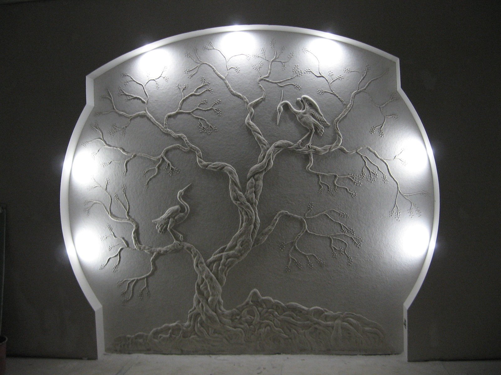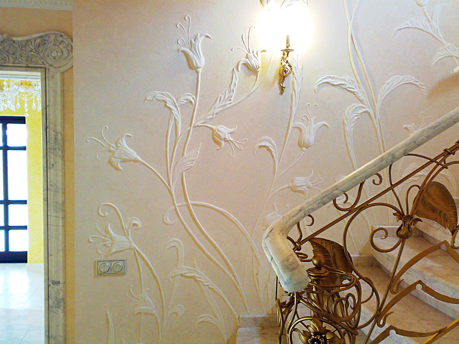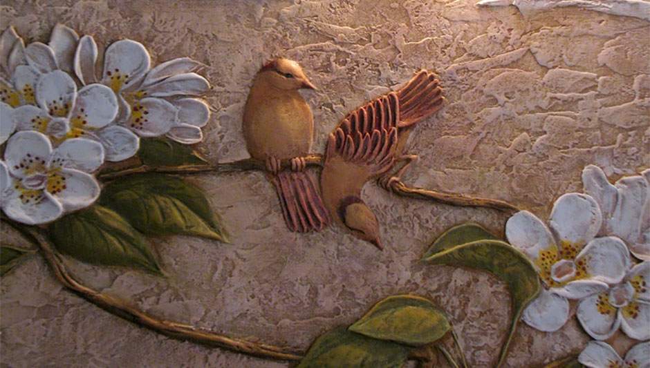 El siguiente paso es transferir la imagen de la plantilla de la película al lienzo preparado. La imagen se aplica a la sección de pared o madera contrachapada y el contorno de la imagen se presiona en el estuco que aún no se ha endurecido por completo. Como resultado, el boceto primitivo está listo. Ahora necesitas darle volumen. Para hacer esto, mezcle la mezcla para esculpir. El alabastro es óptimo, ya que después de la solidificación completa no es inferior en resistencia al hormigón. Pero el yeso puede agrietarse, desmoronarse y teme al agua. El alabastro seco se mezcla con agua inmediatamente antes del trabajo hasta que quede suave. Luego comienzan a dar volumen al patrón impreso. Esto no se hace inmediatamente de una sola vez, sino gradualmente, capa por capa. La profundización se puede hacer raspando parte de la base, o aplicando capas "adicionales" adicionales a los objetos cercanos. En ciertos lugares, los elementos ya hechos en moldes se unen al lienzo. Si es necesario, si la masa se seca rápidamente y el trabajo avanza lentamente, debe humedecerse con agua.
