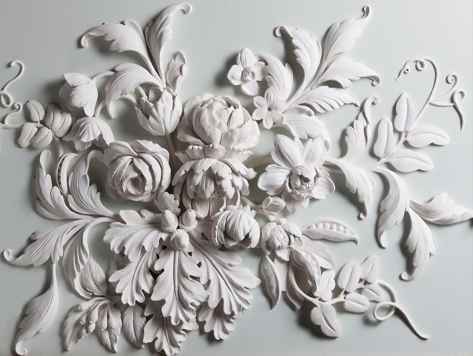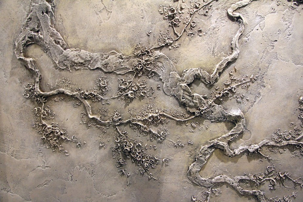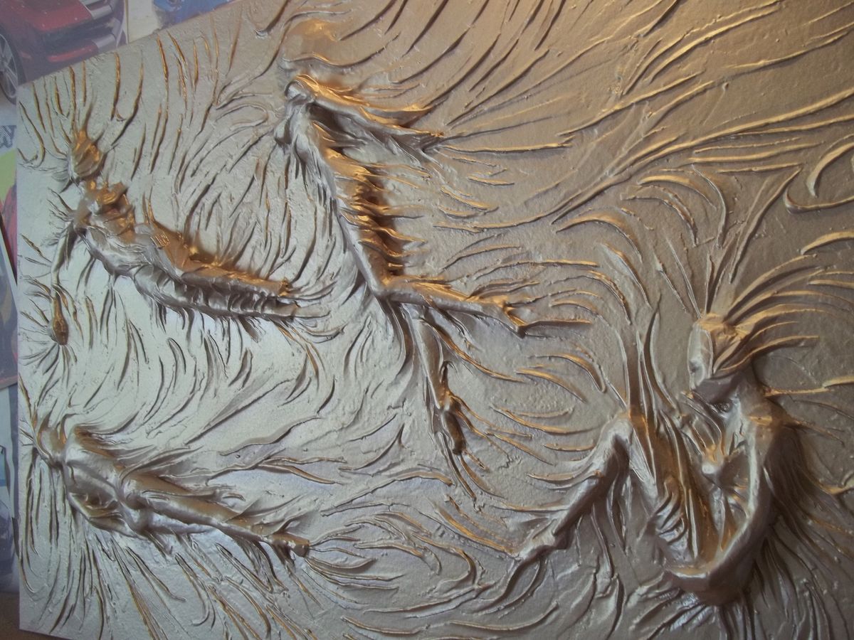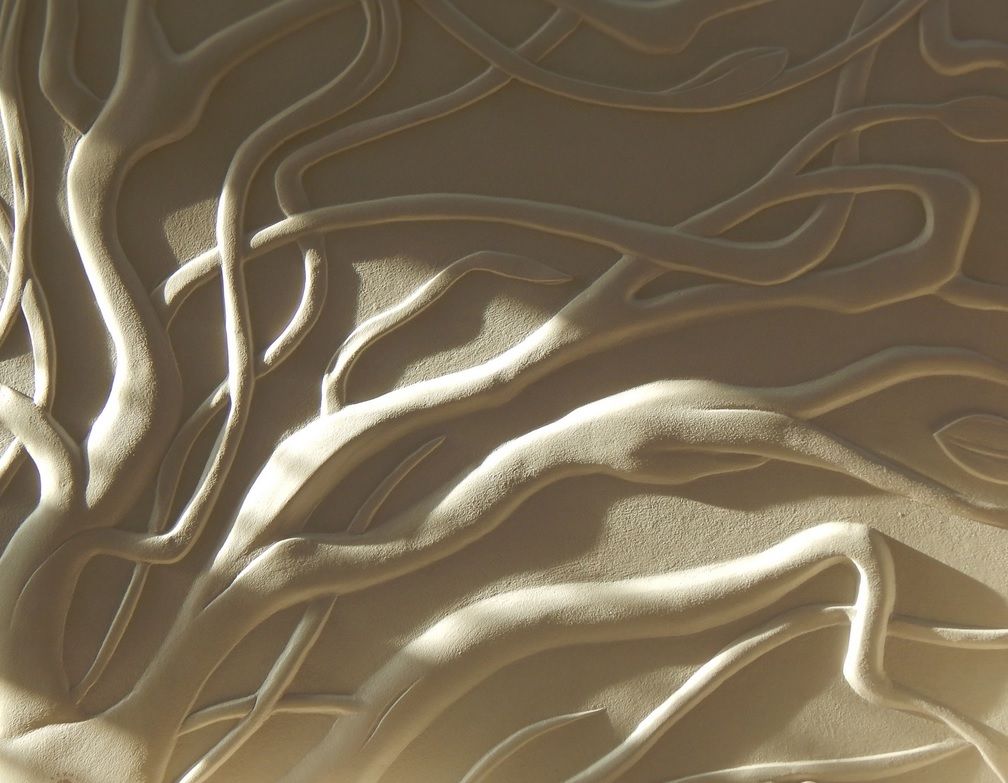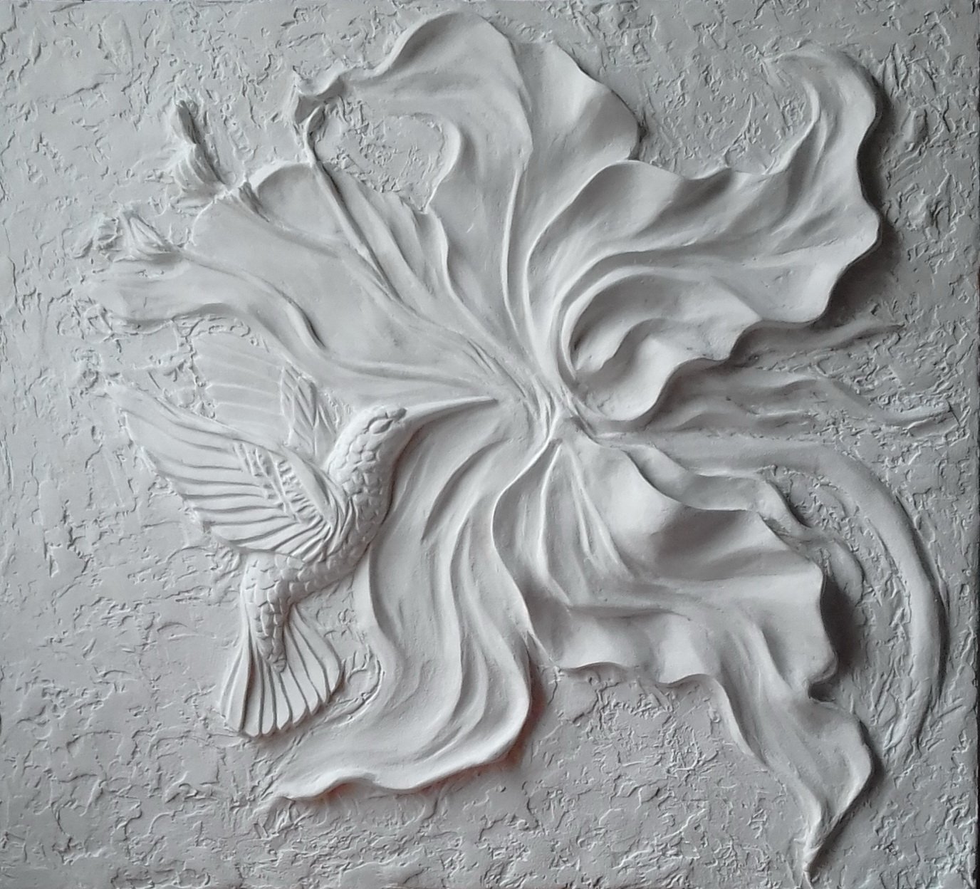 El siguiente paso es transferir la imagen de la plantilla de la película al lienzo preparado. La imagen se aplica a la sección de pared o madera contrachapada y el contorno de la imagen se presiona en el estuco que aún no se ha endurecido por completo. Como resultado, el boceto primitivo está listo. Ahora necesitas darle volumen. Para hacer esto, mezcle la mezcla para esculpir. El alabastro es óptimo, ya que después de la solidificación completa no es inferior en resistencia al hormigón. Pero el yeso puede agrietarse, desmoronarse y teme al agua. El alabastro seco se mezcla con agua inmediatamente antes del trabajo hasta que quede suave. Luego comienzan a dar volumen al patrón impreso. Esto no se hace inmediatamente de una sola vez, sino gradualmente, capa por capa. La profundización se puede hacer raspando parte de la base, o aplicando capas "adicionales" adicionales a los objetos cercanos. En ciertos lugares, los elementos ya hechos en moldes se unen al lienzo. Si es necesario, si la masa se seca rápidamente y el trabajo avanza lentamente, debe humedecerse con agua.