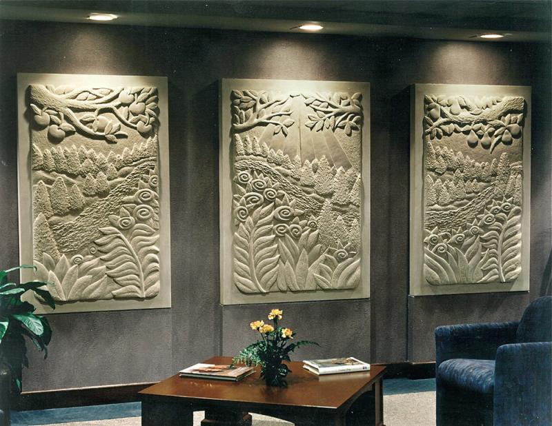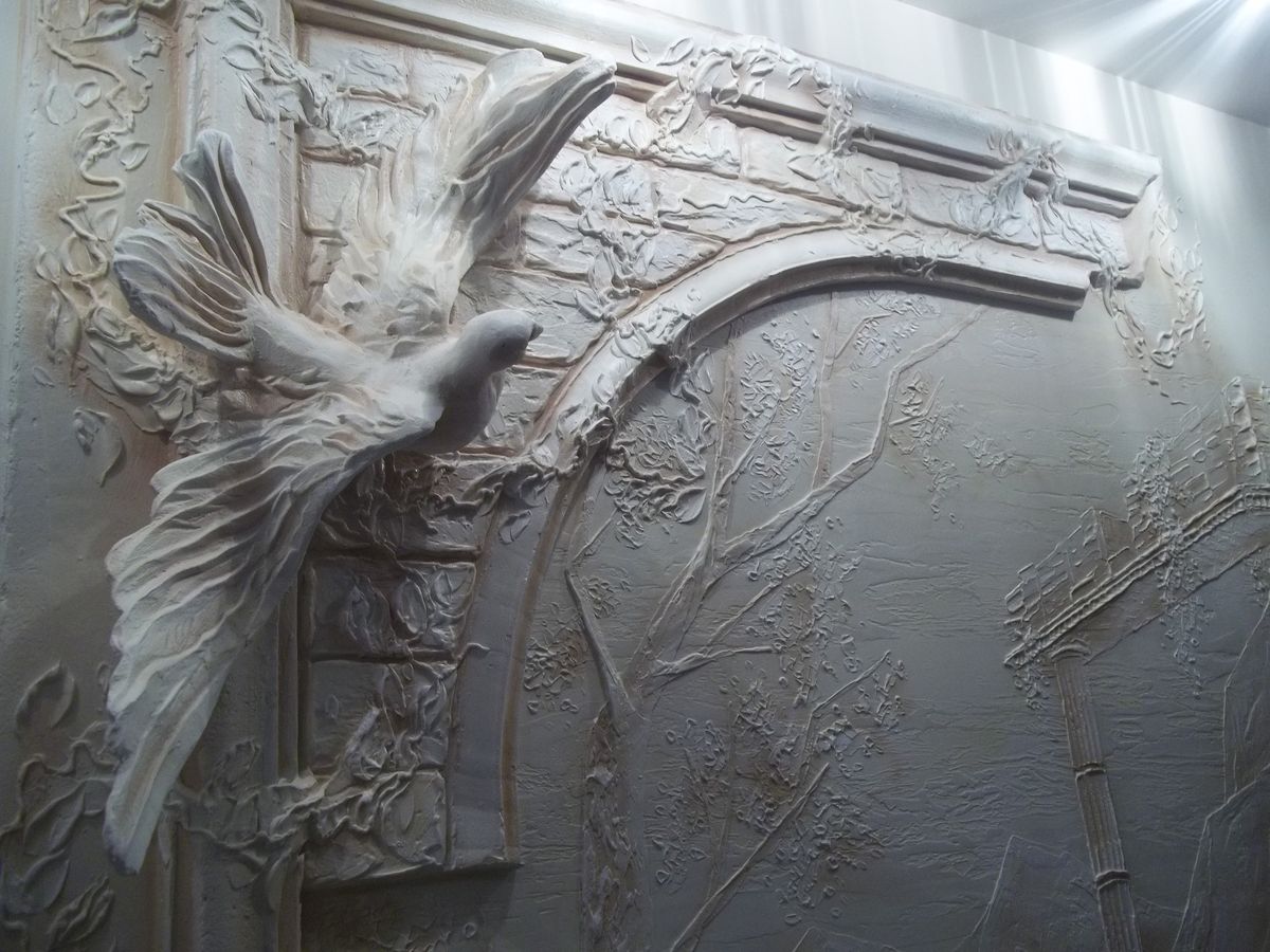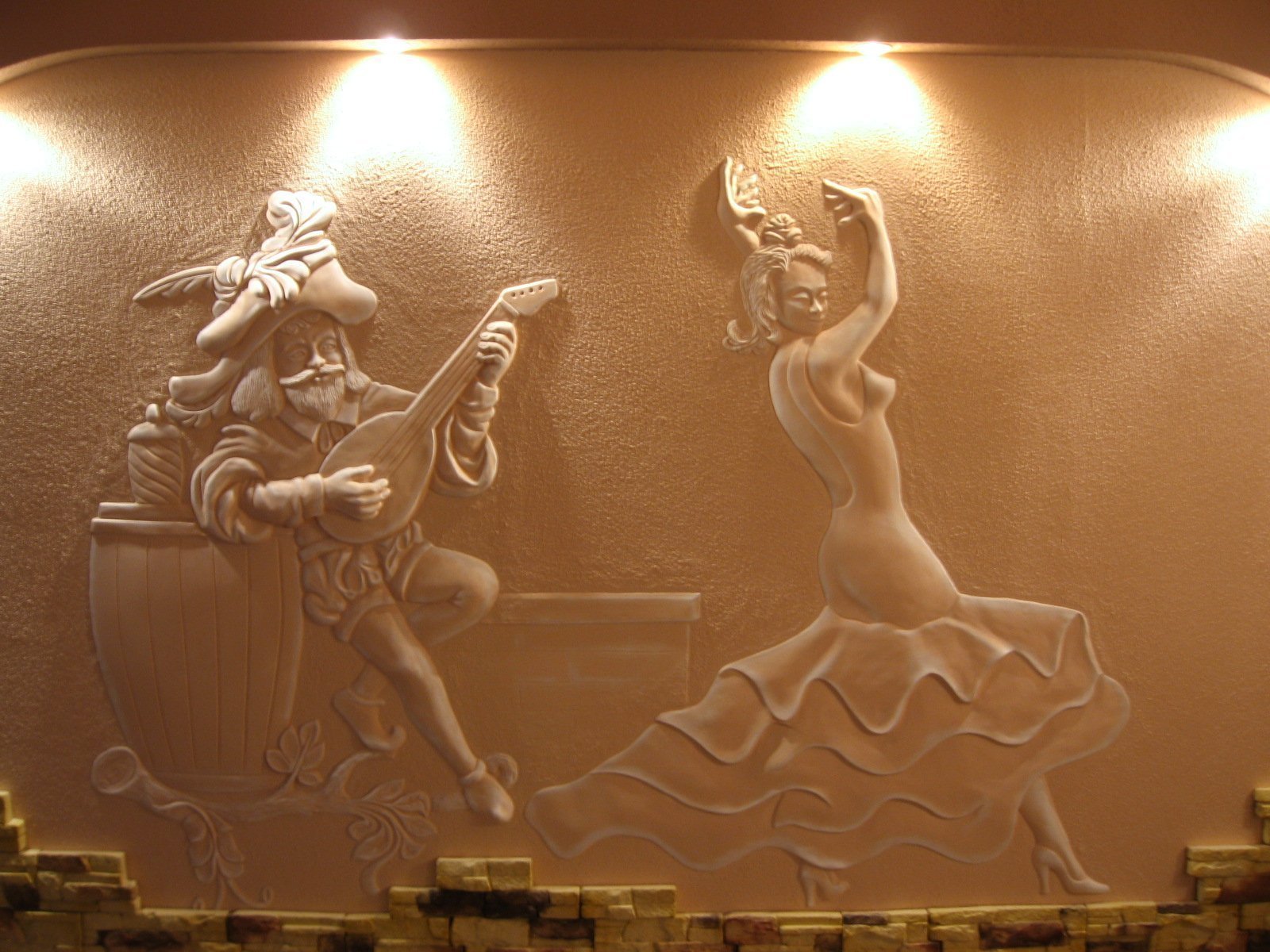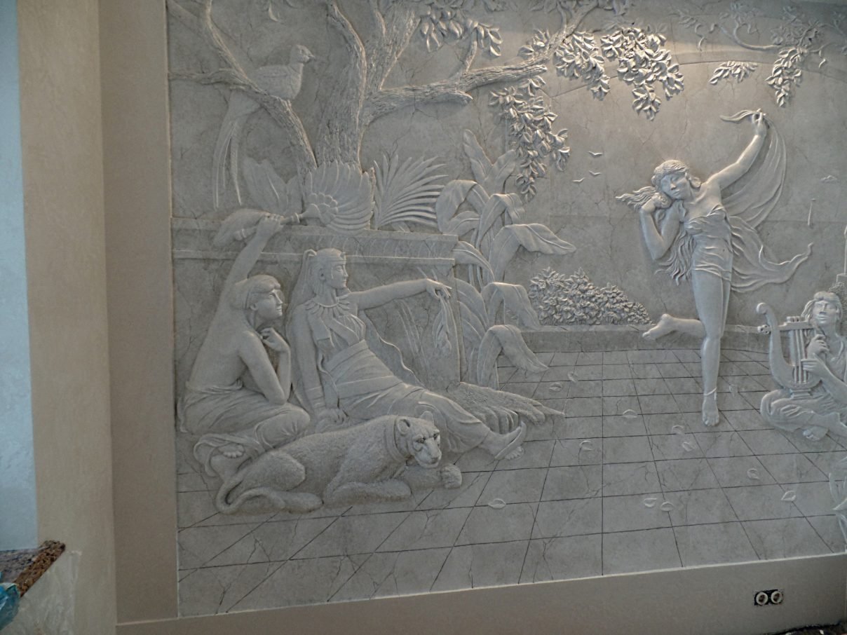 Los problemas de fijar el bajorrelieve a la base se pueden evitar esculpiéndolo directamente en la pared. En otros casos, la composición se coloca sobre silicona líquida o un adhesivo especial. Si el relieve fue modular, luego de arreglar las juntas, se frotan cuidadosamente con masilla. No se recomienda decorar paredes de yeso "endebles" con tal decoración. El material base debe ser confiable y fuerte. También enmascaran cuidadosamente las articulaciones del bajorrelieve y la pared. Es importante saberlo. Por cierto, la composición modular es conveniente para principiantes. Si falla, cualquiera de los componentes del terreno puede reemplazarse sin dañarlo.