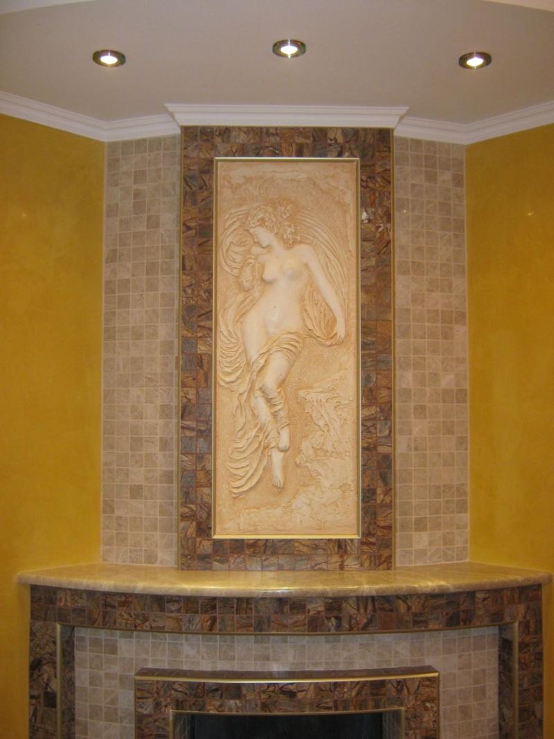 Las composiciones volumétricas están invariablemente asociadas con los estilos clásicos. De hecho, tal decoración se verá apropiada en el diseño del mismo nombre, art nouveau, art nouveau, barroco, rococó, imperio. Pero aquí estamos hablando de esculturas tradicionales, con líneas suaves y muchos detalles pequeños y elaborados. Como regla general, las personas, deidades, criaturas míticas u ornamentos complejos aparecen en el centro de la composición. Un bajorrelieve minimalista se integrará orgánicamente en el estilo moderno: