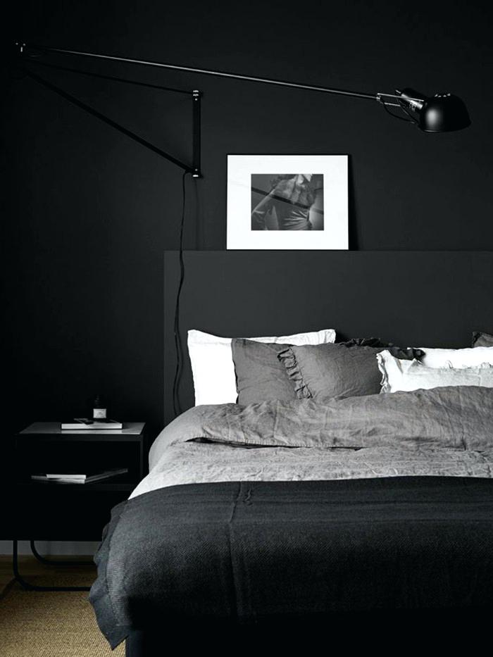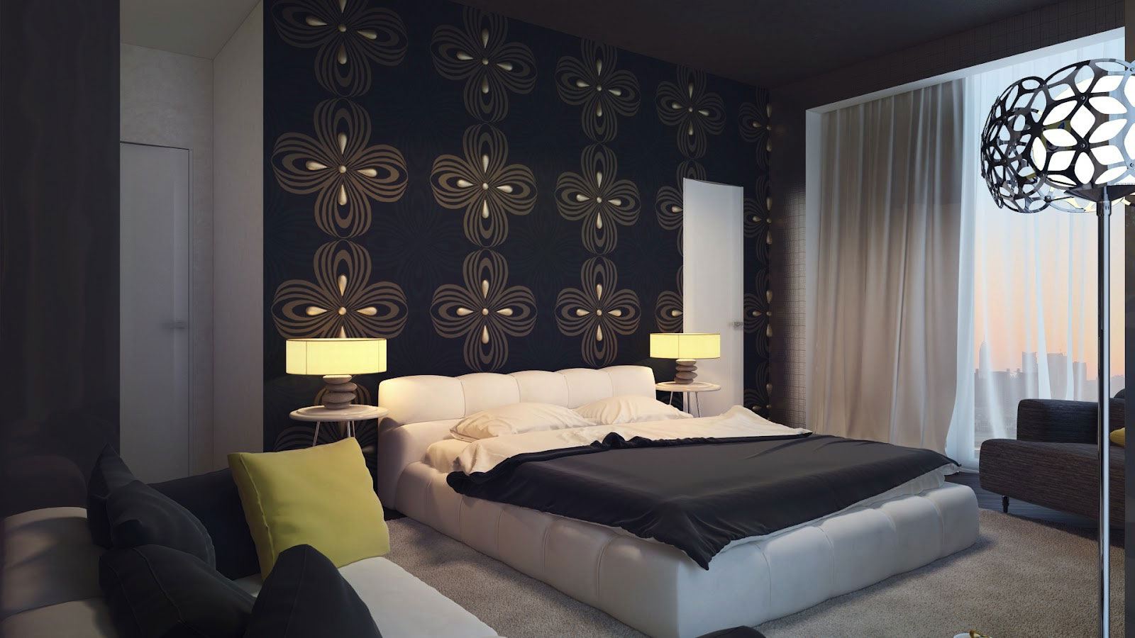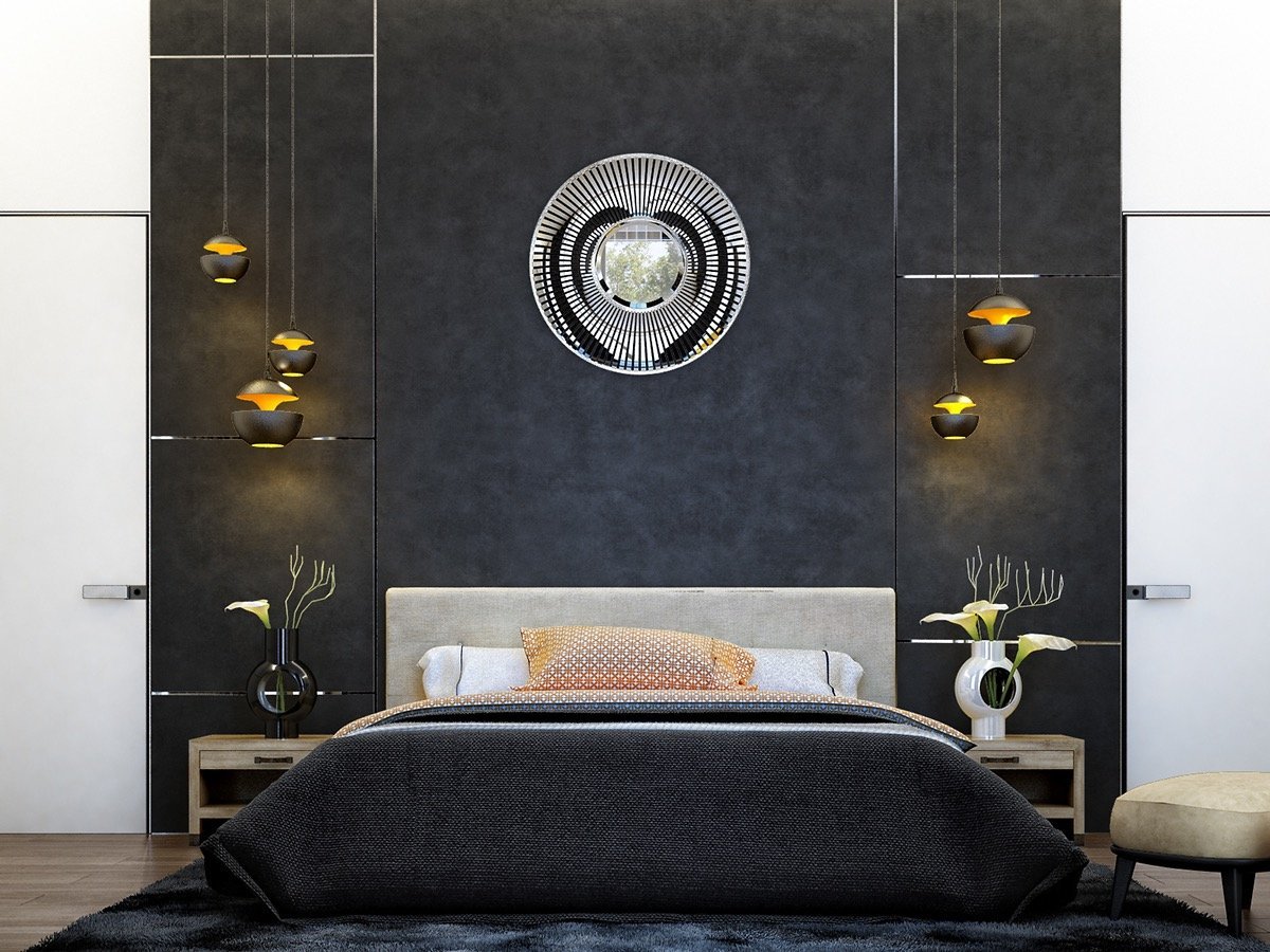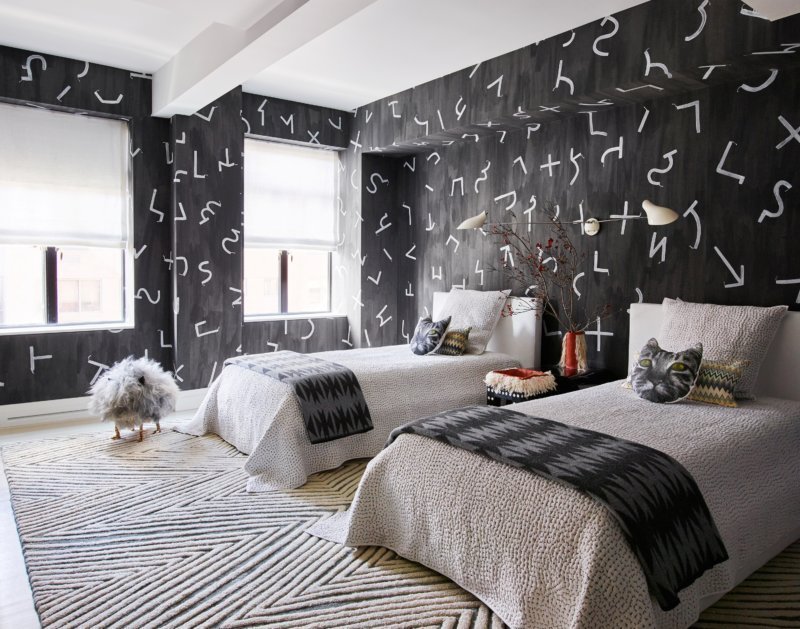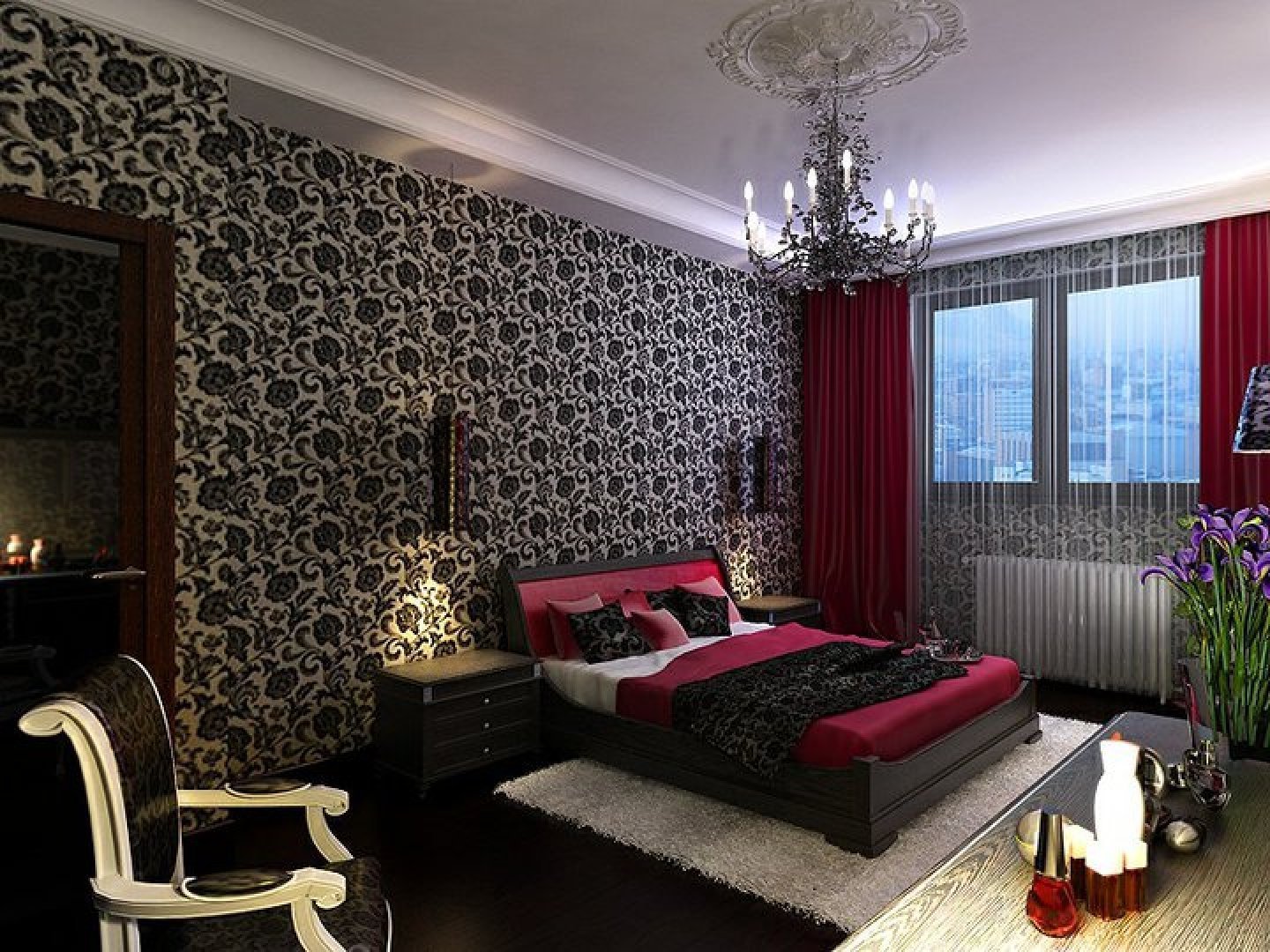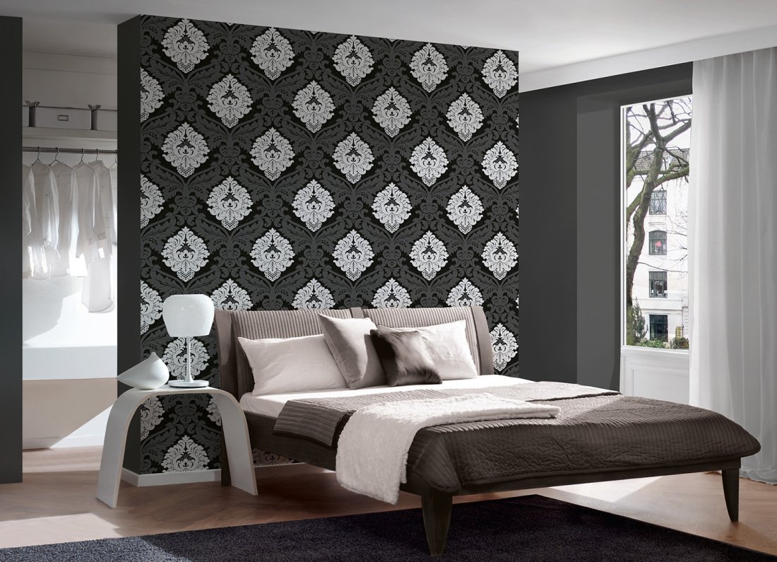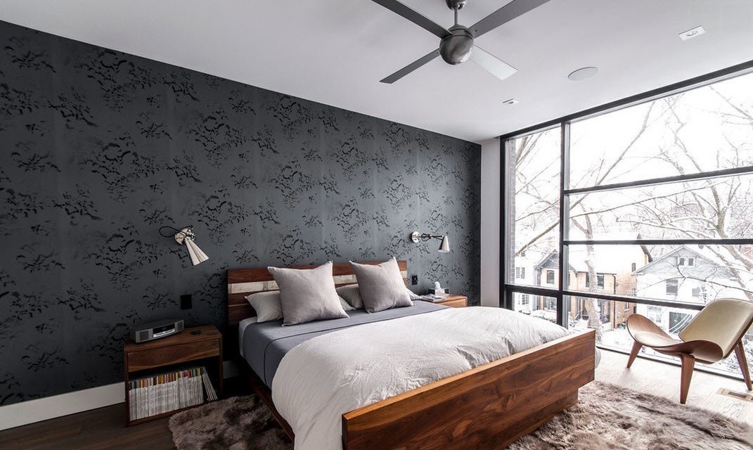 La opción más simple para incrustar el acabado del color carbón en el dormitorio será pegar con él las paredes detrás de la cama.Los materiales pueden ser monofónicos, incluyen adornos aterciopelados u otros, dibujos ligeros y brillantes. Los fondos de pantalla con fotos de la ciudad nocturna también se ven originales. Para crear una mayor comodidad de vida y relajación, se pueden reemplazar por modelos en blanco y negro monocromático: con imágenes, fotos infantiles o familiares.