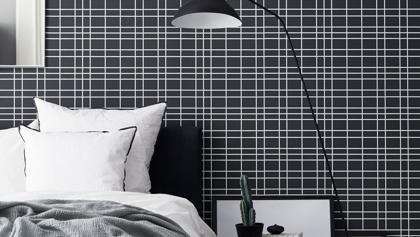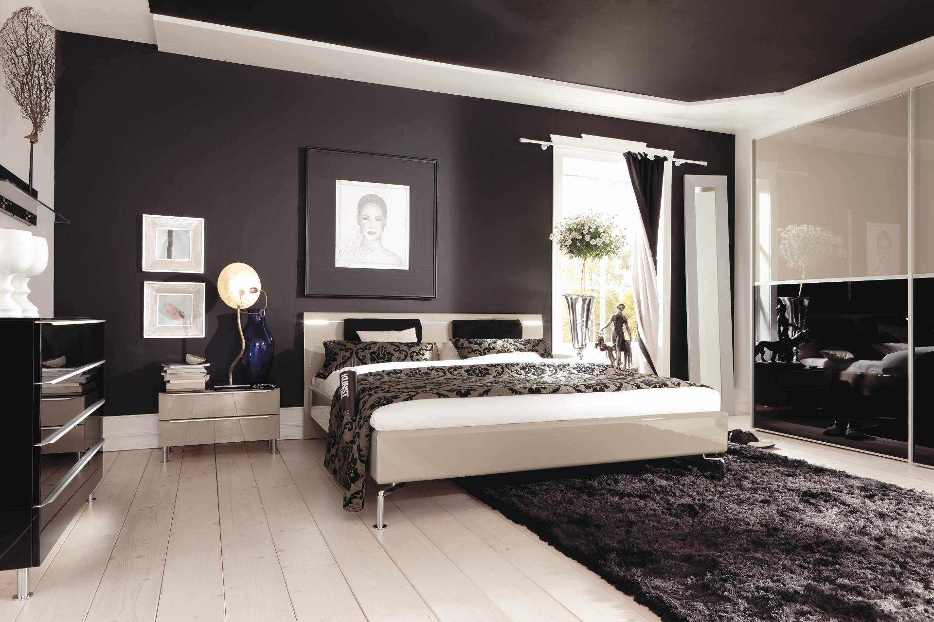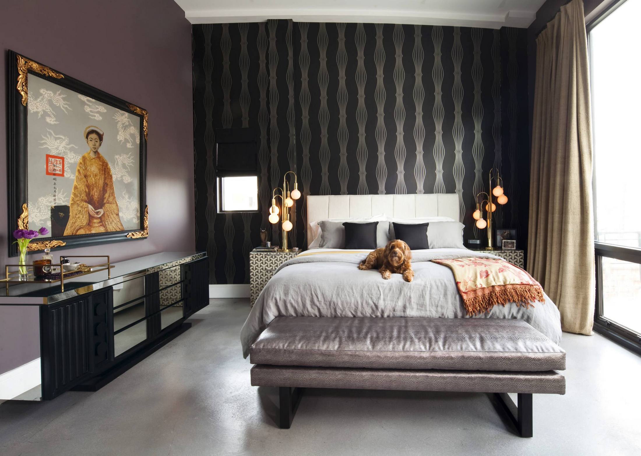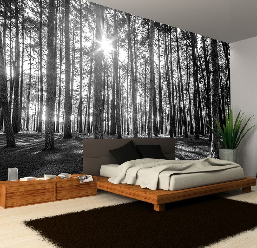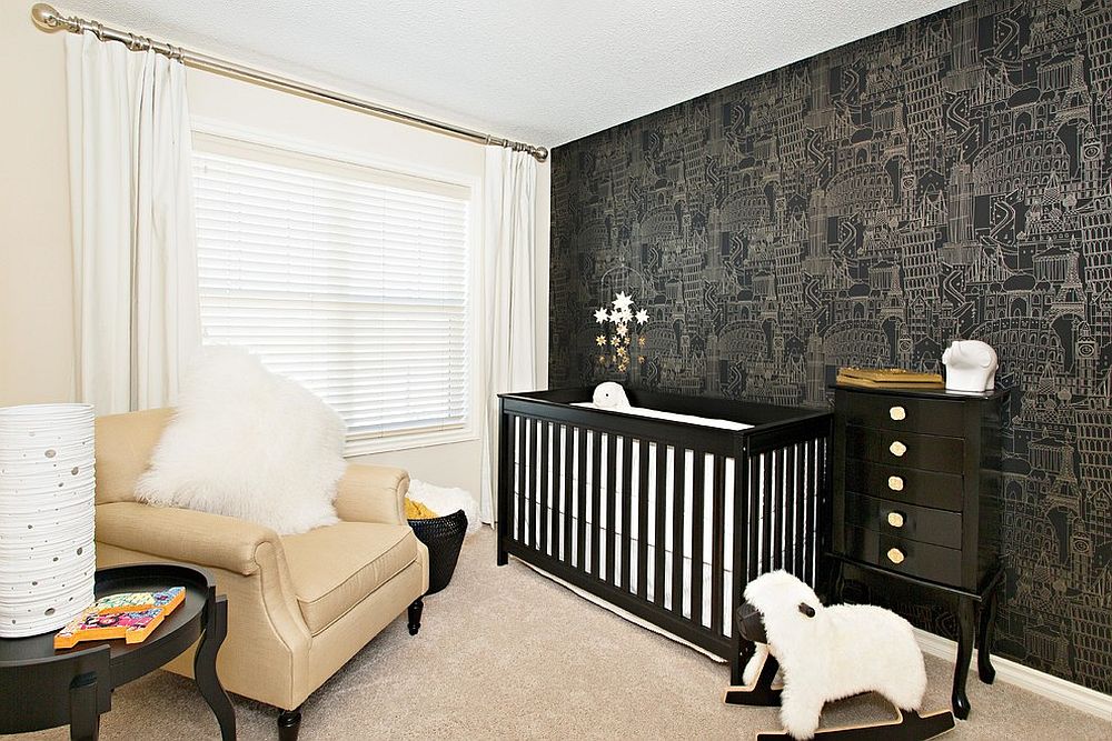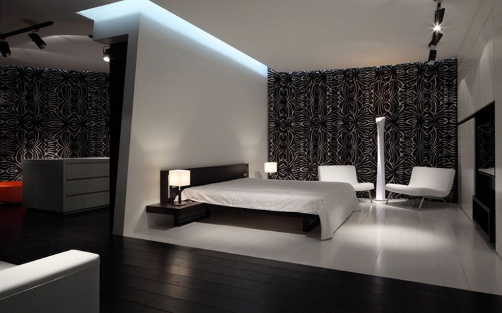 La opción más simple para incrustar el acabado del color carbón en el dormitorio será pegar con él las paredes detrás de la cama.Los materiales pueden ser monofónicos, incluyen adornos aterciopelados u otros, dibujos ligeros y brillantes. Los fondos de pantalla con fotos de la ciudad nocturna también se ven originales. Para crear una mayor comodidad de vida y relajación, se pueden reemplazar por modelos en blanco y negro monocromático: con imágenes, fotos infantiles o familiares.