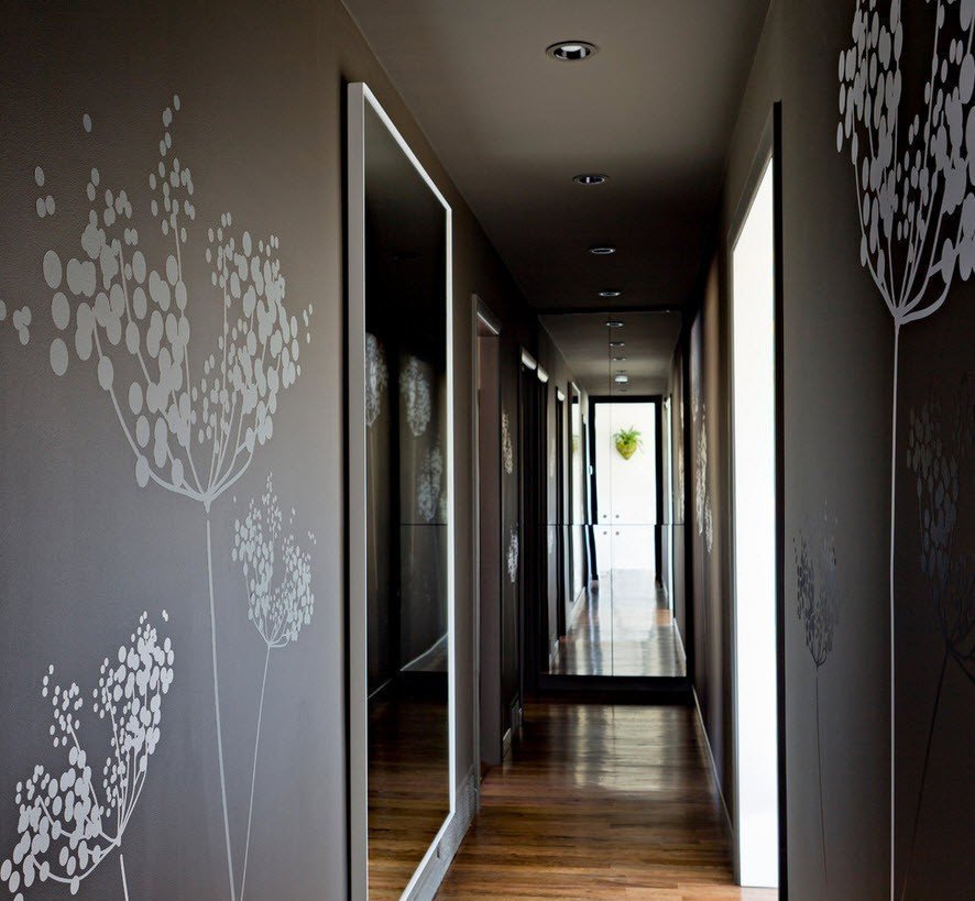 Y para pasillos estrechos y para habitaciones en forma de cuadrado, se recomienda que solo una pared se pegue con molduras negras. Por ejemplo, con su ayuda puede enmarcar la puerta principal. Y puede seleccionar el espacio opuesto al espejo. Cerca de la superficie del espejo, los materiales oscuros se verán menos armoniosos. Se verá bien una combinación de dos tipos de acabados con los mismos adornos: el principal con un fondo claro y oscuro. Este último se recomienda para usar en paredes pequeñas. Los muebles ligeros ayudarán a complementar esta estilización. En el contexto del revestimiento de carbón, se verá aún más brillante.