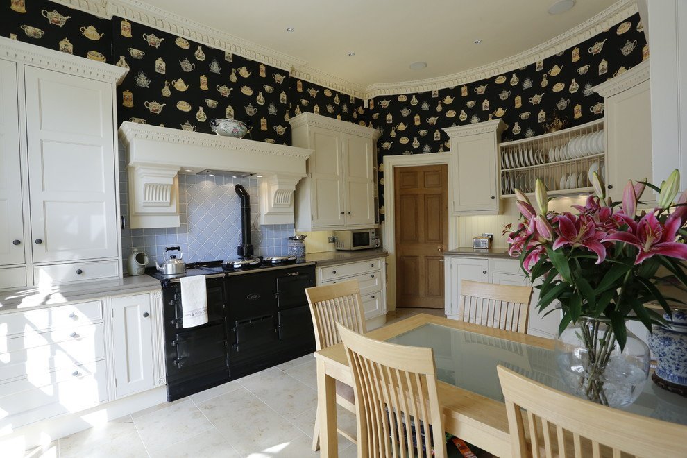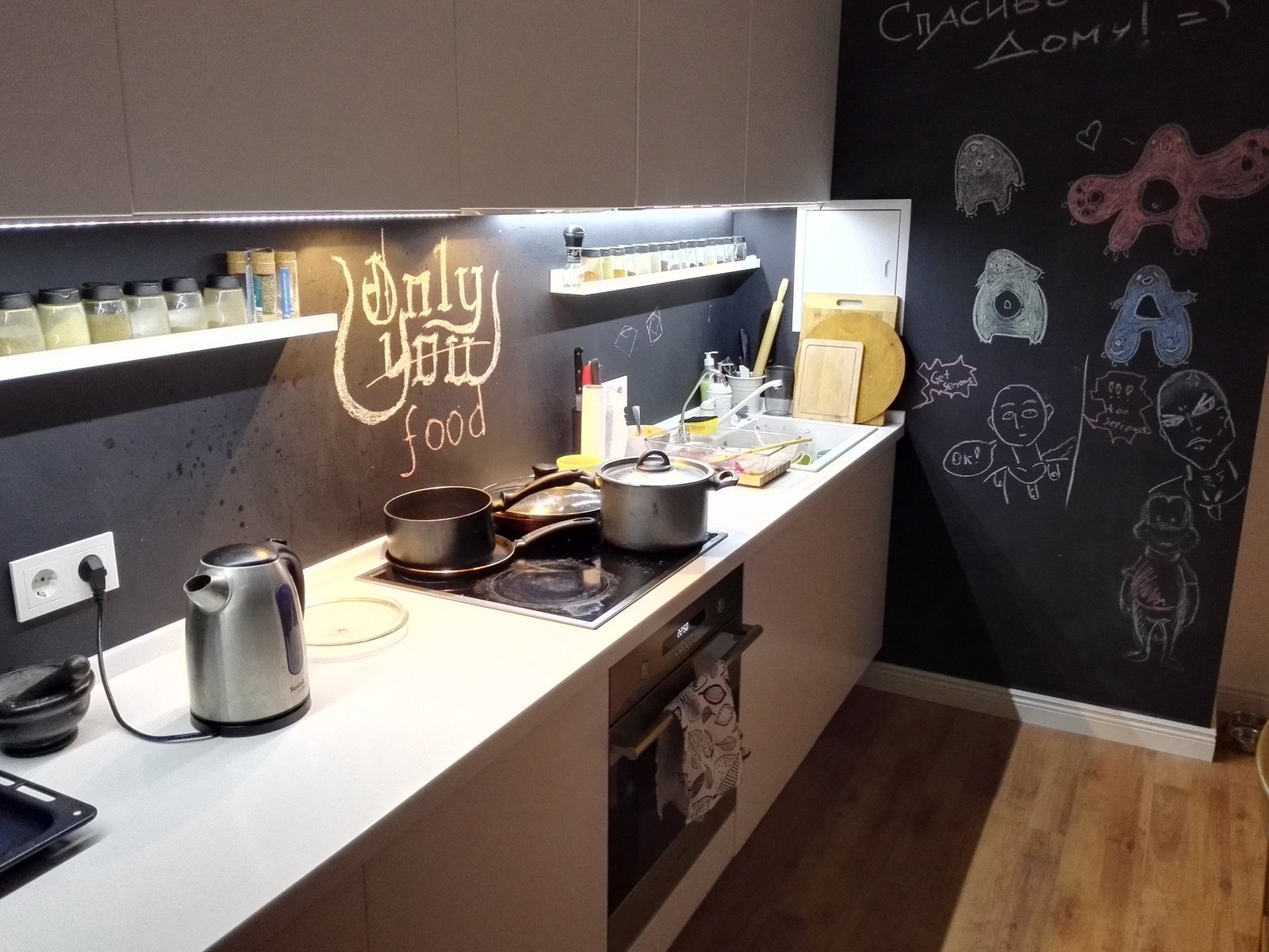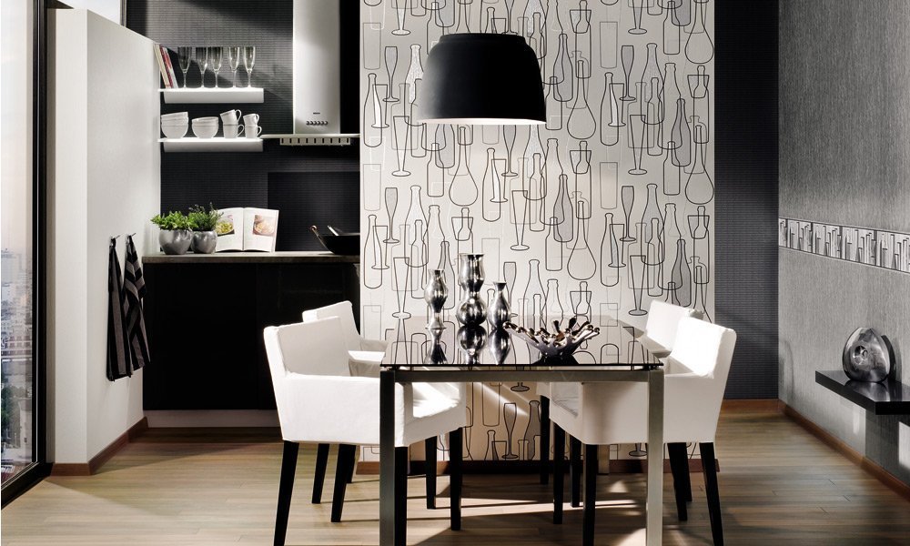 Una opción ventajosa para la decoración personalizada de la cocina es el uso de papel tapiz estampado gris-negro. Se pueden usar para pegar una pared: detrás de un grupo de comedor o detrás de un auricular. Los materiales mate son perfectos para resaltar la zona de cocción. Pero al mismo tiempo, los propietarios deberán cuidar bien la calidad de la iluminación de esta parte. Además, en el contexto del acabado de carbón, los estantes de cromo con especias y una bonita campana se verán hermosos.