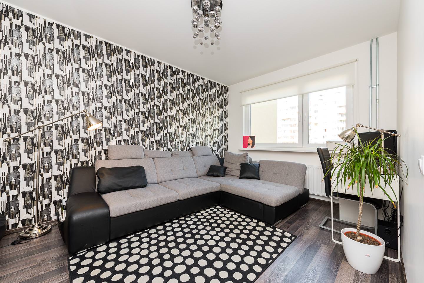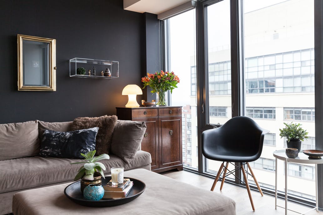 Una excelente solución para diseñar la sala de estar es usar un acabado de carbono para la pared ubicada a la izquierda o derecha de la ventana. El sol que cae hará que sea más fácil iluminar la habitación durante el día. Por la noche, puede ser reemplazado por luces de pared o una luz de fondo ordenada.