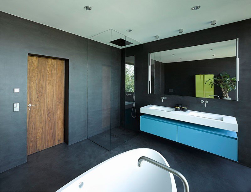Si se usan materiales de carbón para estilizar un baño combinado, entonces es mejor colocarlos detrás de una bañera independiente o en el lado opuesto de la bañera montada en la pared. Alta humedad, la humedad puede estropear la apariencia del acabado.