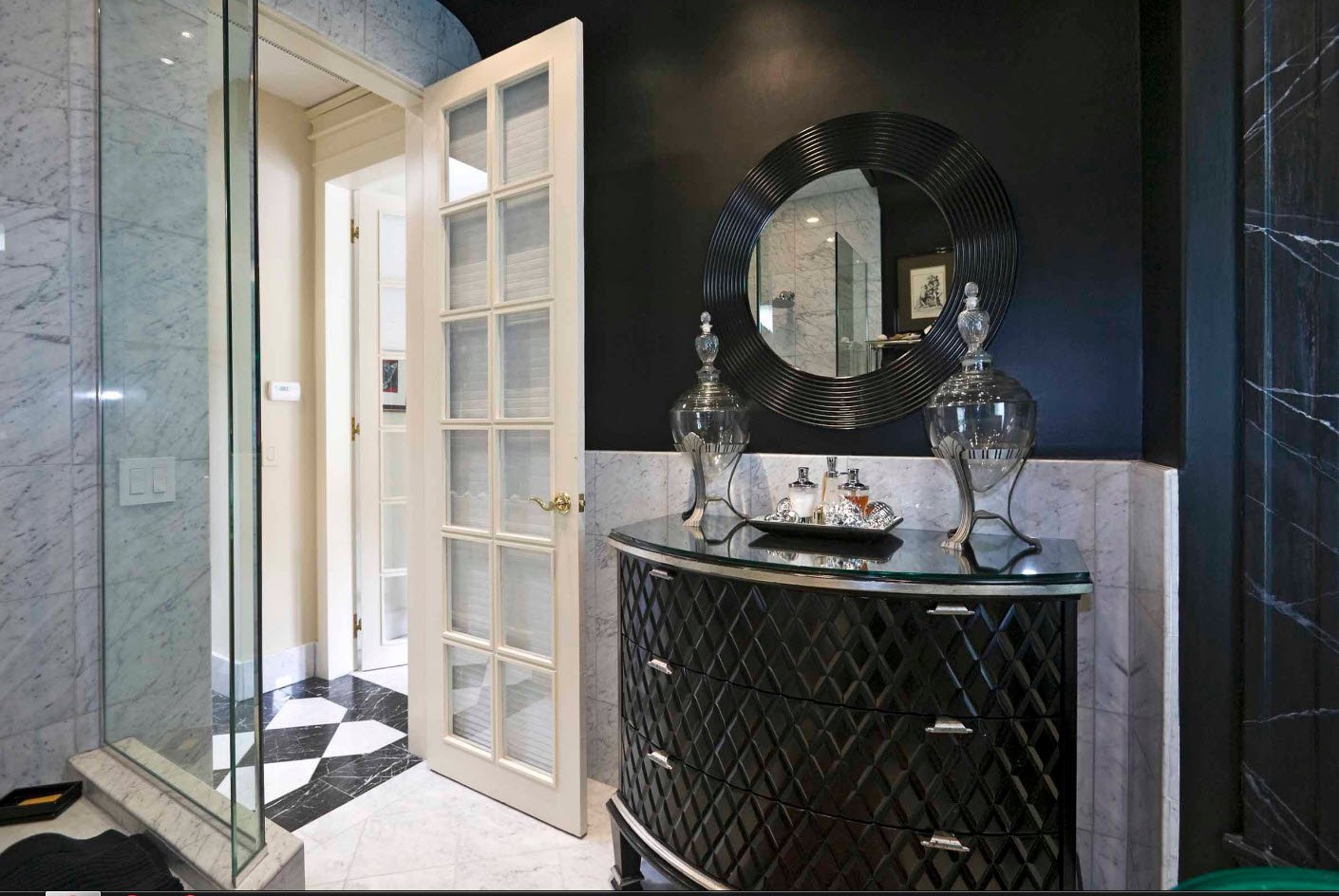 El acabado en carbón brillante complementa a la perfección la moderna tecnología plateada. Juntos se verán elegantes y modernos. Se permite una transición de color suave de resina a un color más brillante o más claro. Por lo tanto, dos paredes adyacentes se pegan con materiales de carbono y el resto: pastel, acabado brillante. Para facilitar la transición, la ubicación en las juntas de una decoración pequeña o la fijación en las esquinas de piezas de piedra artificial en colores apropiados.