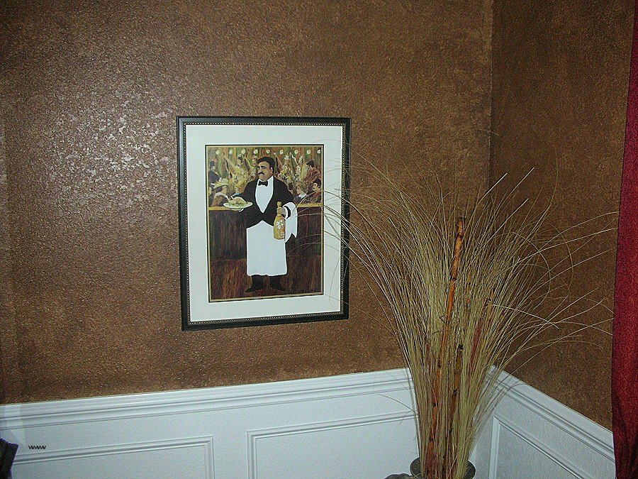 El resultado de la pintura parece que las paredes de la habitación están cubiertas de cuero, que se ve muy sólido en la oficina, el gabinete, varios interiores caros: barroco, imperio, clásico. El acabado es el siguiente: