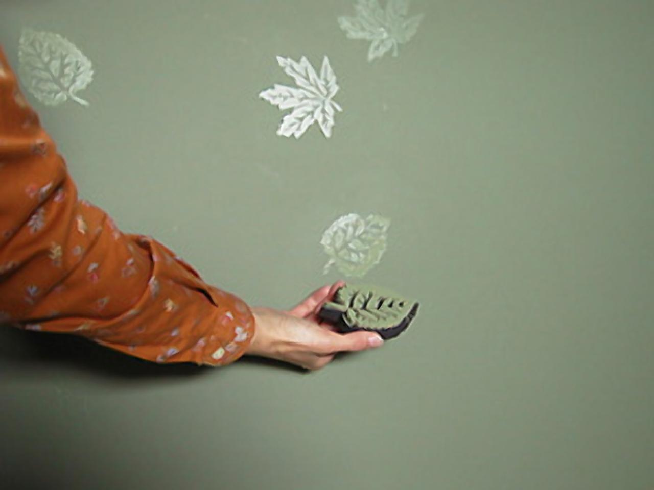 La pintura se aplica a través de una plantilla usando brochas, un rodillo, un hisopo de espuma y una pistola rociadora.