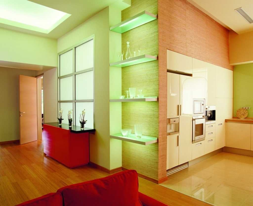 El color se destaca por un rincón de trabajo, un comedor, un juego, un área para dormir, que es muy conveniente para usar en apartamentos tipo estudio. Puede ser un rectángulo brillante o una figura enmarcada por líneas rectas.