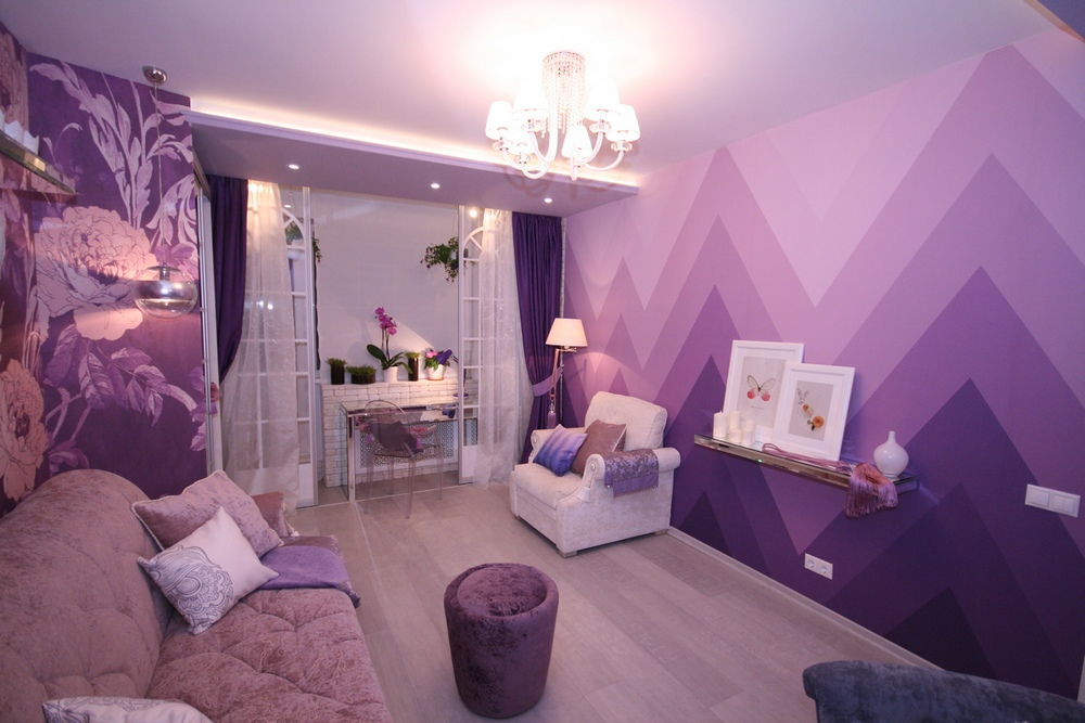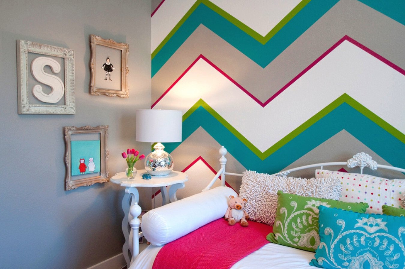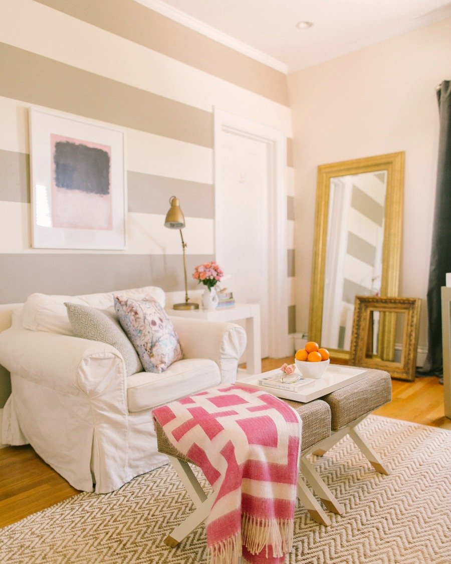 Rayas: una versión simple pero original de la decoración, que le da dinamismo a la habitación. Con su ayuda, se logran varios efectos que cambian la forma del espacio: las líneas verticales visualmente hacen que la habitación sea más alta, las líneas horizontales expanden la habitación, las diagonales se ven muy originales. La cinta adhesiva se pega en la dirección correcta, se pinta en lugares "vacíos", espera a que la pintura se seque, despega la cinta y obtén una pared "rayada".