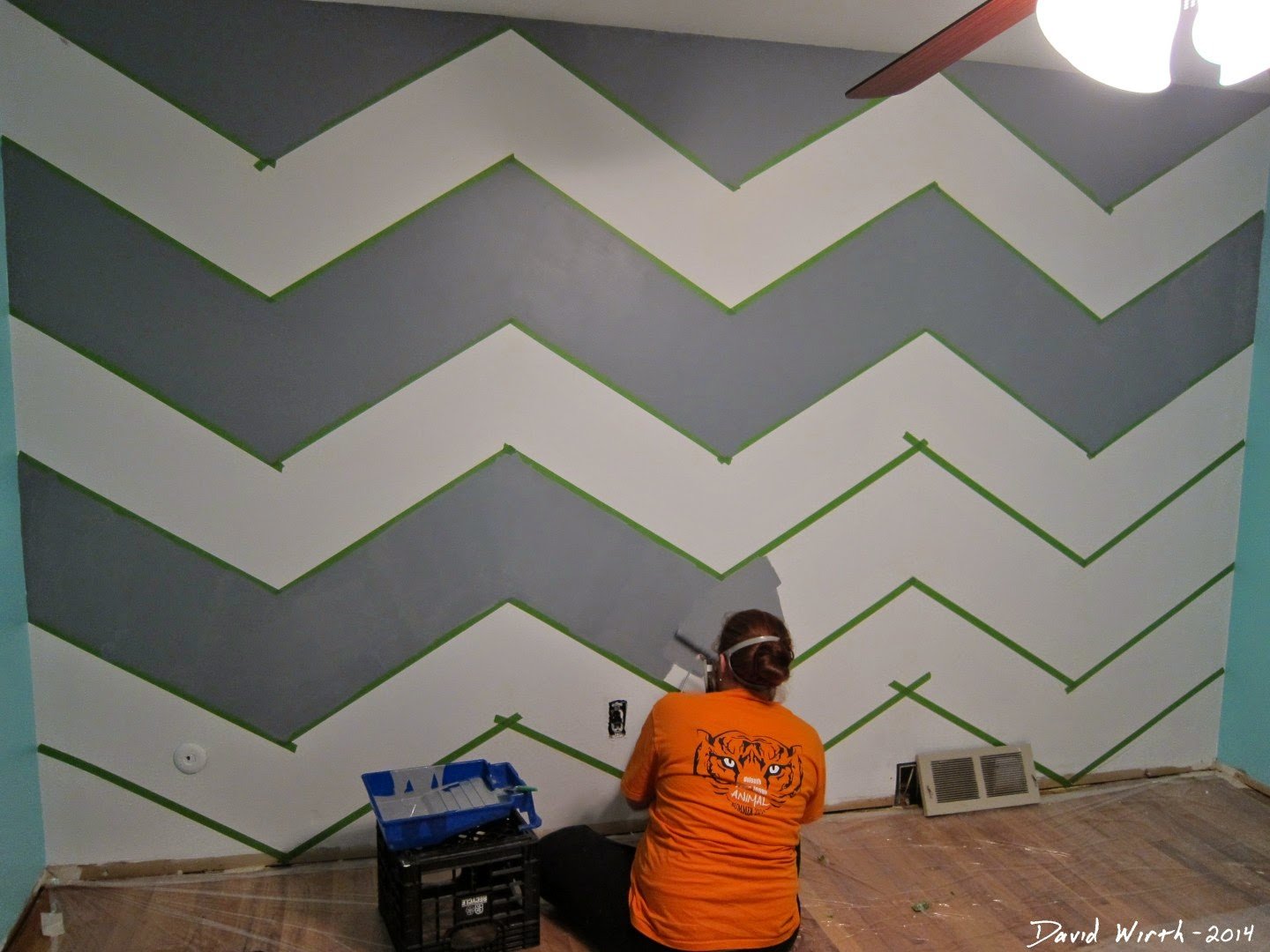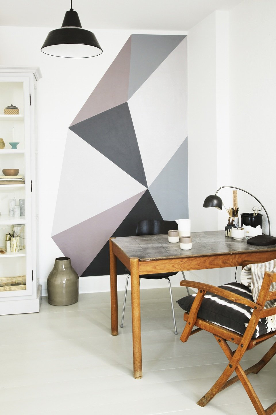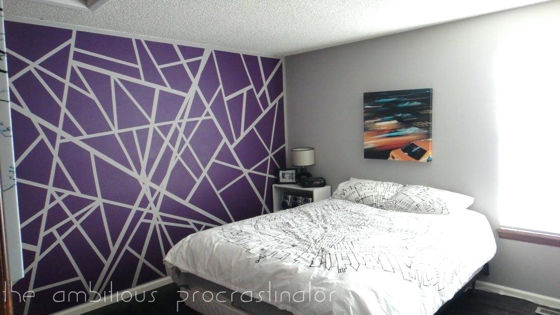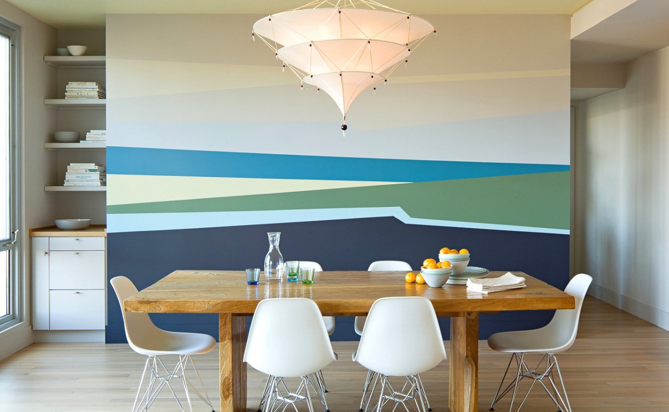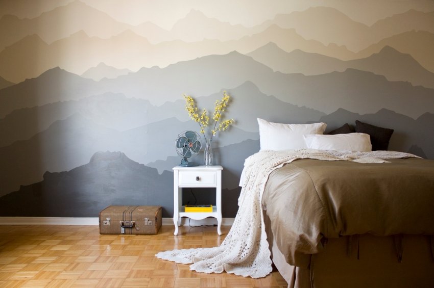 Para la imagen, deberá marcar previamente la pared, pegar trozos de cinta adhesiva a lo largo de la marca y luego pintar.El diseño se ve muy original, adecuado para varios interiores.