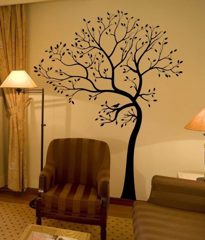 El elemento decorativo en forma de árbol es muy popular en los interiores modernos. Esta decoración no tiene fondo, por lo que la imagen pegada parece dibujada por separado en la pared. El árbol en sí puede ser absolutamente cualquier cosa, verde, floreciente, otoño, con frutas, fabulosas o con fantásticas ramas adornadas. Si coloca fotografías familiares en el marco de dicha imagen, obtendrá un árbol genealógico original. También en las ramas puede organizar pájaros o animales, como resultado se lanzará una historia interesante. Una pegatina de árbol de Año Nuevo puede reemplazar un árbol real durante las vacaciones de invierno.