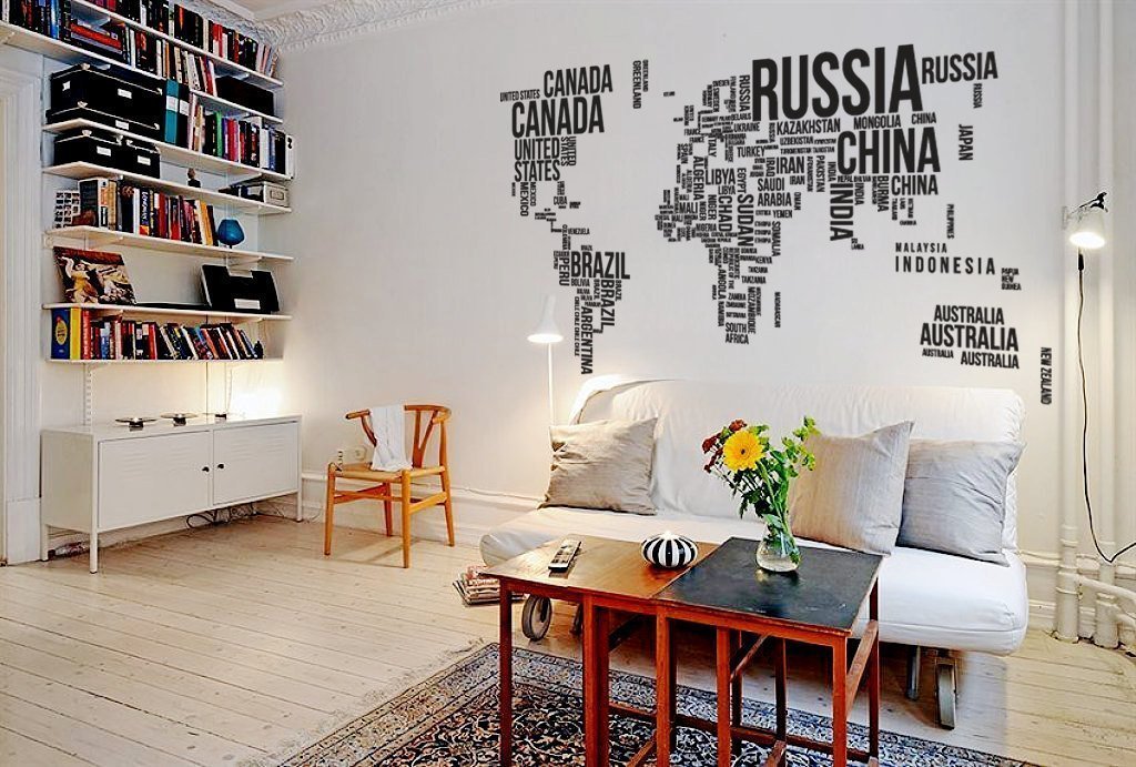 Las imágenes grandes ocupan la mayoría de las paredes, mientras que el diseño de la habitación cambia dramáticamente y el espacio vital se expande visualmente. Este puede ser un mapa geográfico inusual del mundo, un enorme ramo de flores, una composición de la trama de una ciudad nocturna con siluetas de dos amantes, una imagen de un león real o un mamut magnífico. Hay muchas opciones Algunas pegatinas decorativas pueden parecer grandes cuadros de artistas famosos o como fotografías realistas con un efecto 3D en toda la pared.