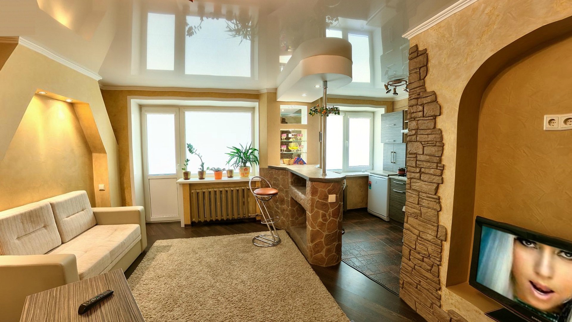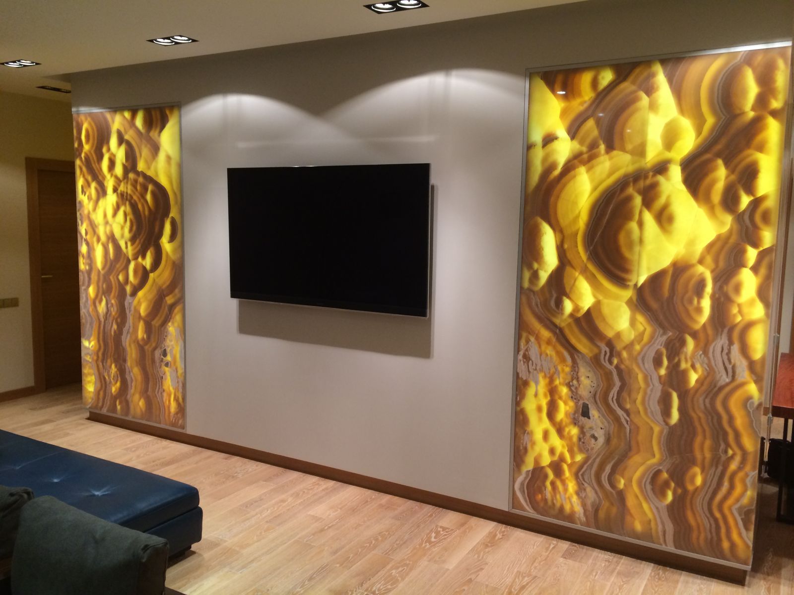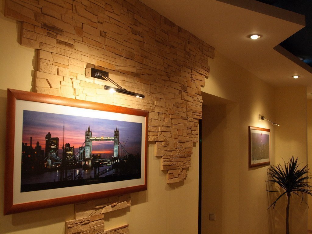 Una esquina sobresaliente está terminada en el pasillo, la iluminación de ónice con LED crea composiciones mágicas.La piedra en la composición interior se combina con yesos decorativos, techo tensado, papel tapiz con textura. Puede colocar de ladrillos un dibujo que se asemeje a un árbol, una ciudad, figuras de criaturas vivientes, abstracciones. El balcón está terminado parcial o completamente, pero se deben evitar los materiales pesados para evitar el colapso.