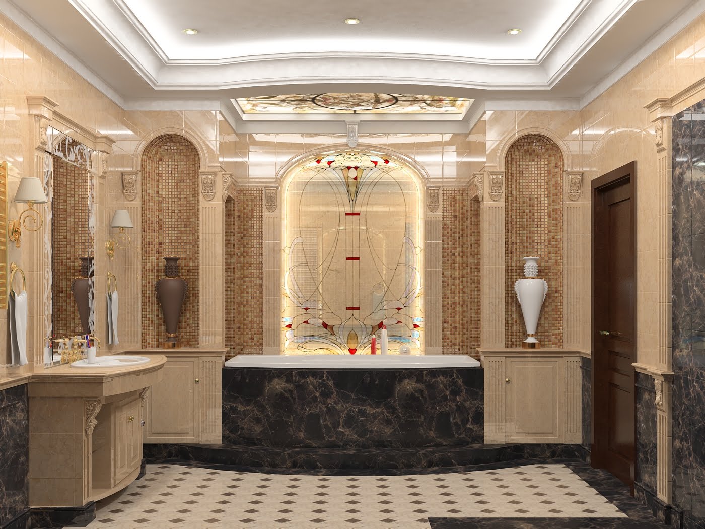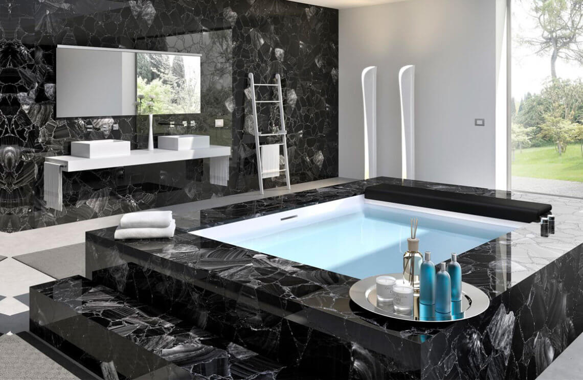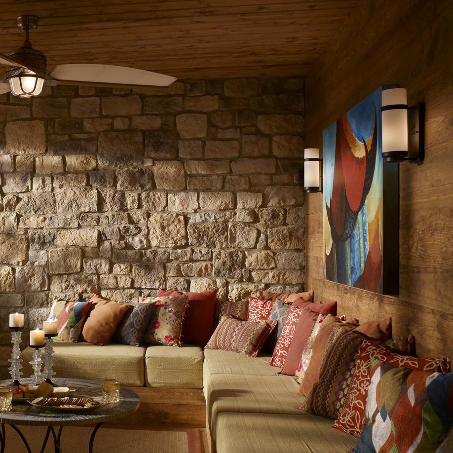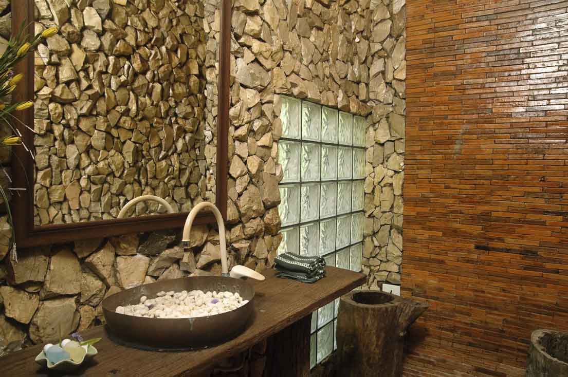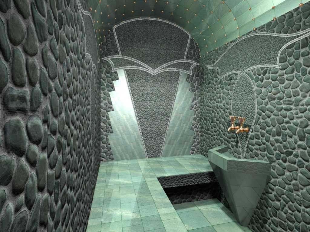 Para diseñar el baño, utilizan ónix natural, mármol, un mosaico, una "cascada" de diferentes piedras son adecuadas. Las paredes del pasillo los cubren parcialmente, completamente, colocan el arco. Las fuentes de luz colocadas correctamente se ven bien, por lo que la piedra se ve más rentable. Cuando se usa sin iluminación adicional, en lugares que no son visibles desde la calle, se obtiene un efecto de cueva.