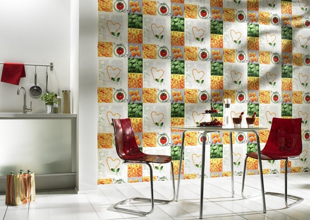El espacio aéreo de la cocina está constantemente saturado de humedad. El papel tapiz inestable a una atmósfera húmeda para la decoración de la pared no funcionará. La estructura debe ser un alimento inodoro que permita un cuidado higiénico, práctico. No se recomienda empapelar la superficie sobre el área de trabajo; con una mayor carga en forma de gotas de agua, grasa, baldosas de cerámica y paneles de plástico serán mejores.