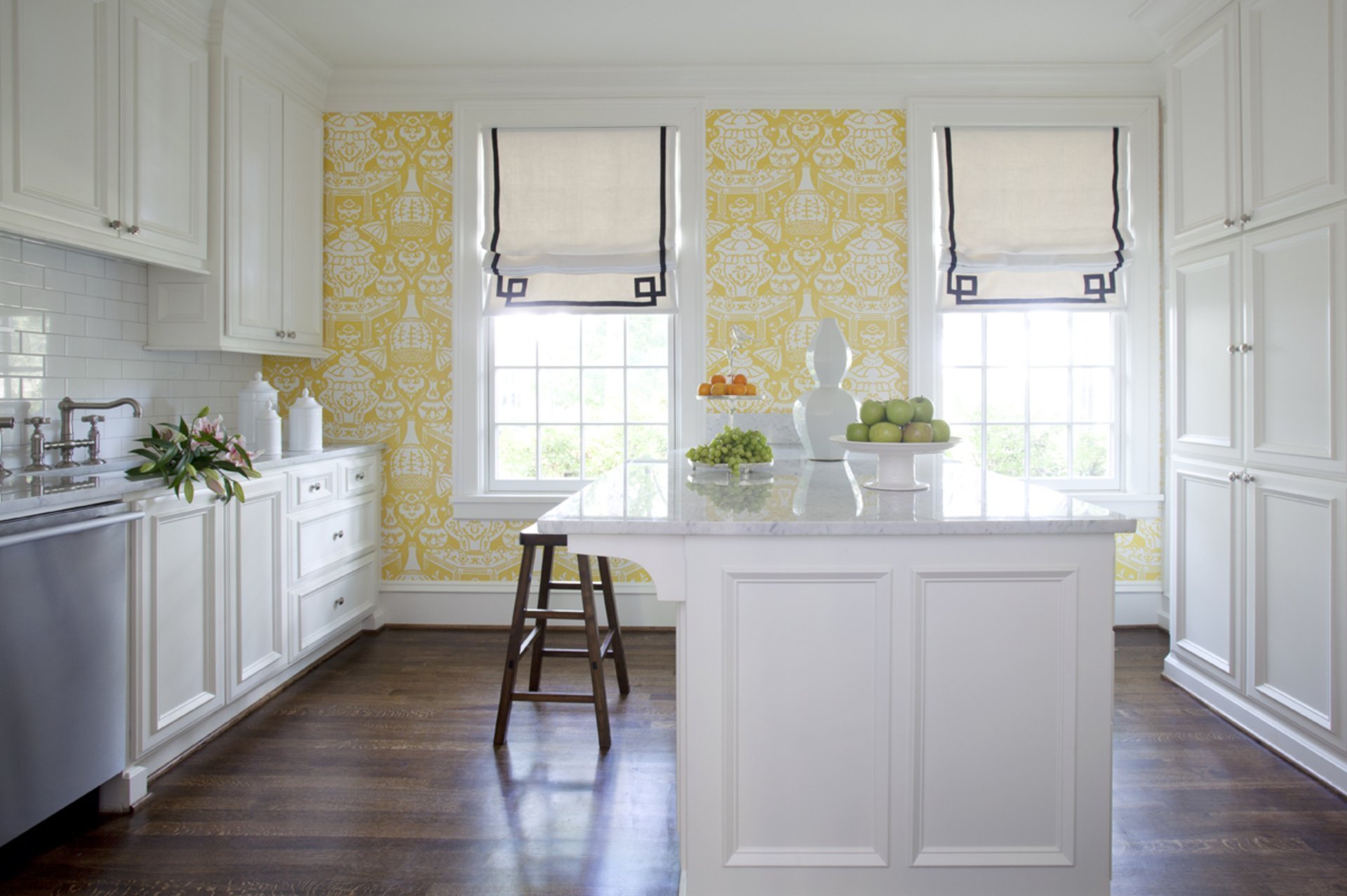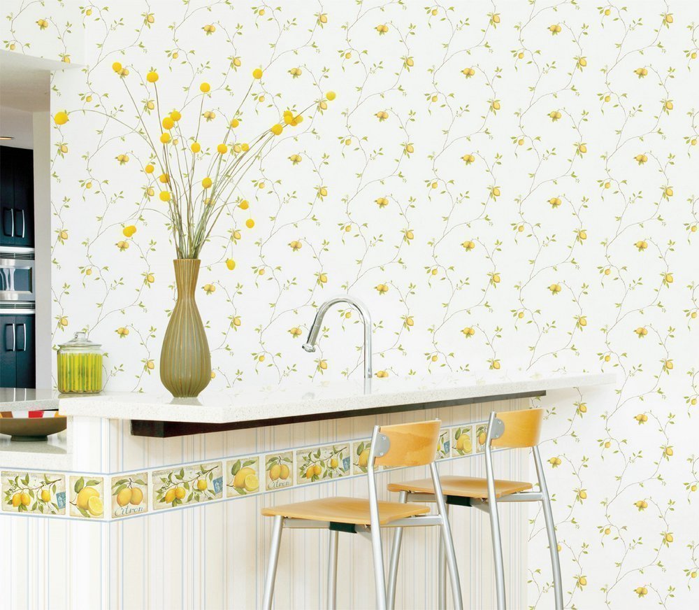 El color más común para el papel tapiz de la cocina es el amarillo. Tonifica, mejora las cualidades comunicativas, puede influir en la digestión, aumenta el apetito. Debido a su "vivacidad" en las habitaciones, salas comunes, prácticamente no se utiliza un color tan alegre. Aunque la opción de decoración de la cocina es óptima, existe el riesgo de molestia, muchas personas se cansan rápidamente del papel tapiz amarillo. Es necesario utilizar el color correctamente combinando con otros colores más tranquilos, eligiendo un color con el máximo cuidado. Puede recomendar el estilo amarillo de la cocina a las personas seguras, alegres y amigables. La decoración de las paredes en tonos amarillos se adapta a cocinas pequeñas, habitaciones sombreadas.