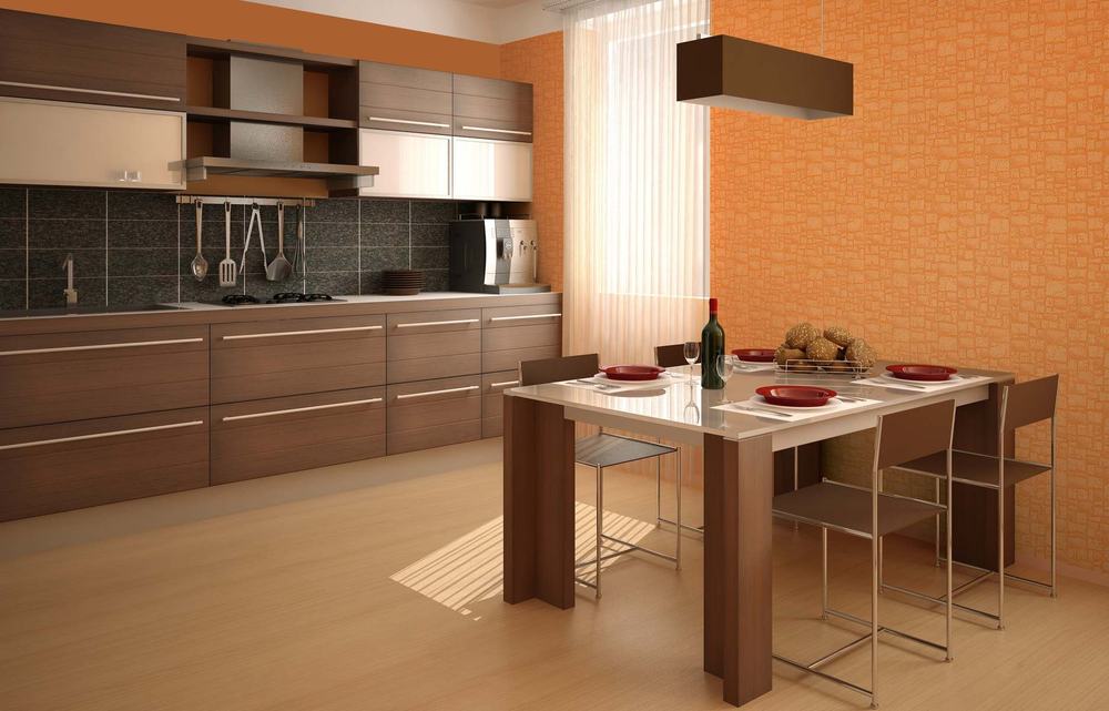 La cocina está decorada con papel pintado con un patrón liso no convexo. Las partículas de polvo se empaquetan en los elementos de la textura volumétrica. Se hace más difícil limpiar la habitación, los fondos de pantalla voluminosos servirán mucho menos en condiciones difíciles de cocina.
