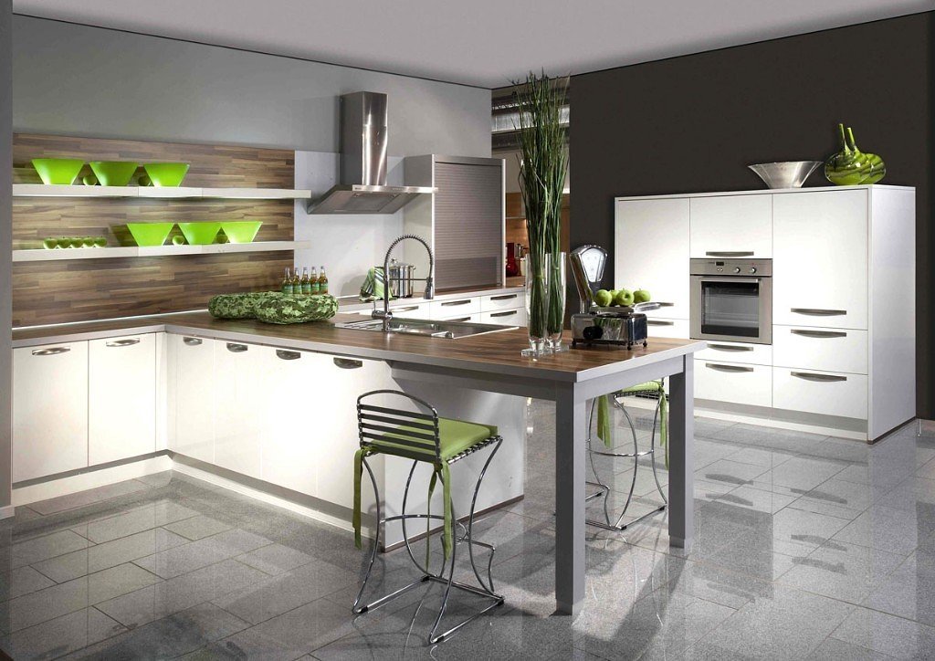 Hay miles de tonos de verde, desde la esmeralda rica hasta el verde pastel. Si los tonos oscuros son más apropiados en el interior de las salas de estudio, las bibliotecas, la gama de luz agrega frescura, ligereza y atmósfera a la cocina que nunca termina en verano. Combine materiales decorativos verdes con muebles contrastantes: naranja, gris sobrio, beige, negro elegante. El verdor desencadena favorablemente delantales hechos de azulejos de cerámica, refresca el interior y agrega armonía especial al interior de la cocina.
