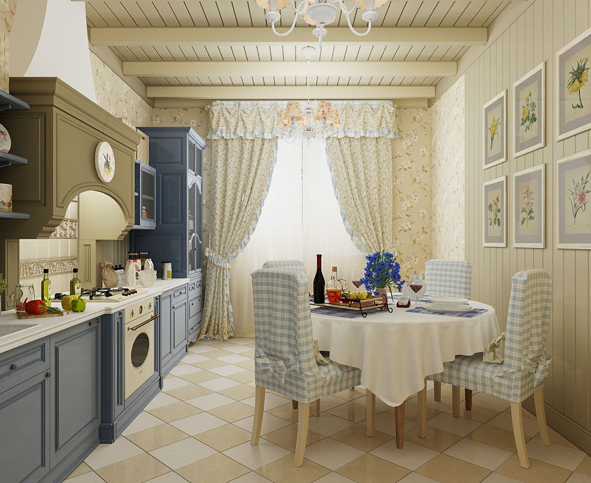 Decoración de pared adecuada con paisajes rurales, imágenes de cafeterías francesas. Se agrega algo de provincialismo mediante dibujos de pequeñas casas, animales, diversos objetos de la vida rural.