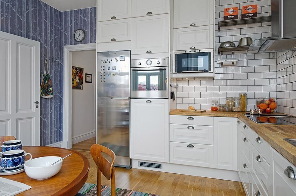 El ambiente de los países escandinavos es fácil de encajar en el interior de la cocina: muebles de formas estrictas y concisas, la ausencia de tul en las ventanas, el papel tapiz correspondiente en tonos brillantes, posiblemente blancos como la nieve. El lienzo de las paredes sin dibujos solo enfatizará muebles y artículos de decoración. El estilo escandinavo se enfatiza con éxito decorando las paredes con papel tapiz líquido.