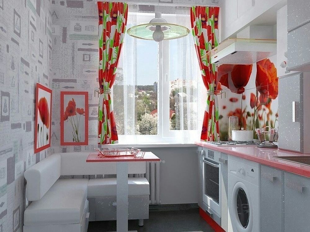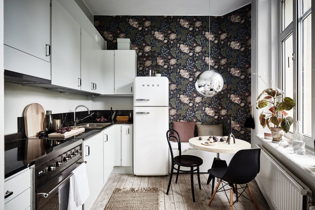 Una solución universal que ayuda a expandirse, facilita un área limitada: un recubrimiento blanco con un patrón texturizado. Los fondos de pantalla suaves y blancos como la nieve en una pequeña cocina pueden parecer un poco aburridos, es mejor diluirlos. Como se mencionó anteriormente, pegar una de las paredes con negro puede salvar la situación. A primera vista, puede parecer que es imposible cubrir la cocina con un hermoso fondo de pantalla no banal. Esto no es del todo cierto, con un poco de esfuerzo, atención a los detalles, puede crear un diseño de formato individual y elegante en su cocina.