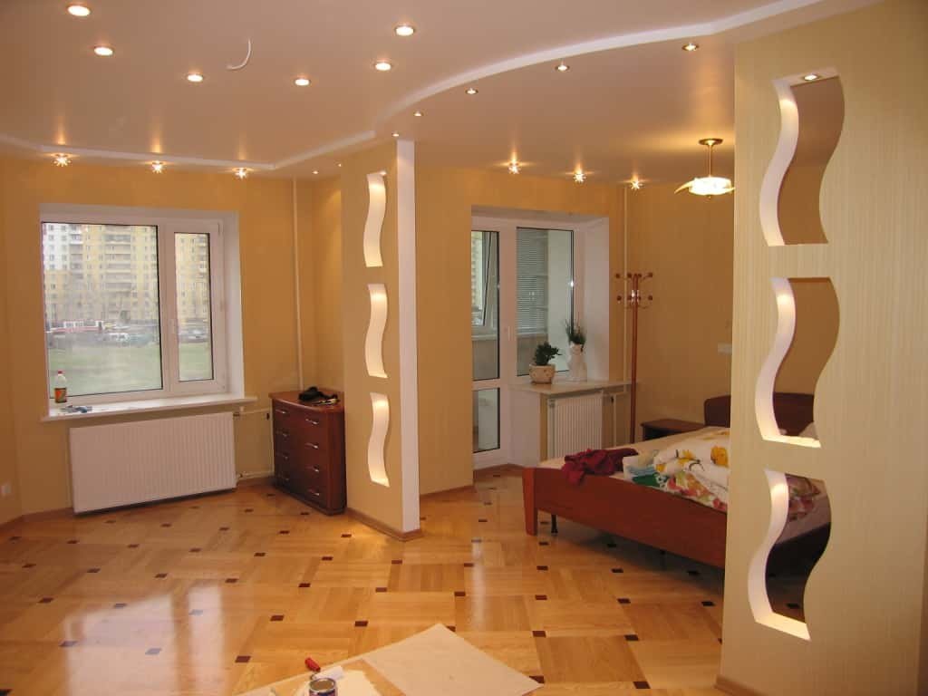 Usando paneles de yeso en el interior, es posible crear cualquier composición en relieve, para realizar las ideas más interesantes. Para hacer esto, primero debe diseñar con qué patrón o forma particular desea decorar las paredes.A continuación, se prepara la sala, se libera el espacio de trabajo. Se debe limpiar la superficie, aplicar masilla a las grietas y aplicar marcas para la futura composición en relieve. Se instala un marco de perfil a lo largo de las líneas marcadas, que posteriormente se enfunda con láminas de pladur con tornillos autorroscantes. La figura resultante se debe poner, después de lo cual se puede decorar con pinturas, papel tapiz, piedra decorativa o en mosaico