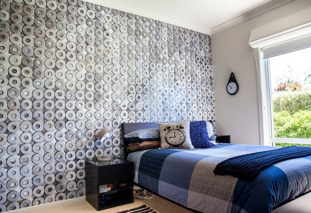 La solución más económica. Son monofónicos, con una textura similar a la madera, piedra salvaje, con patrones, diferentes en densidad y resistencia al agua. El método de combinación vertical u horizontal agregará un giro. Papel - higroscópico, no tejido y vinilo - fuerte, esconde defectos, cullet - resistente al daño, repintado.