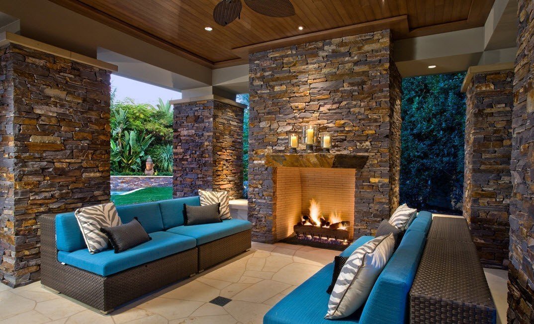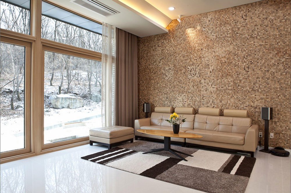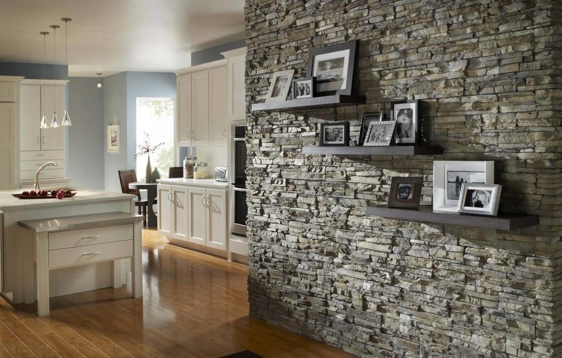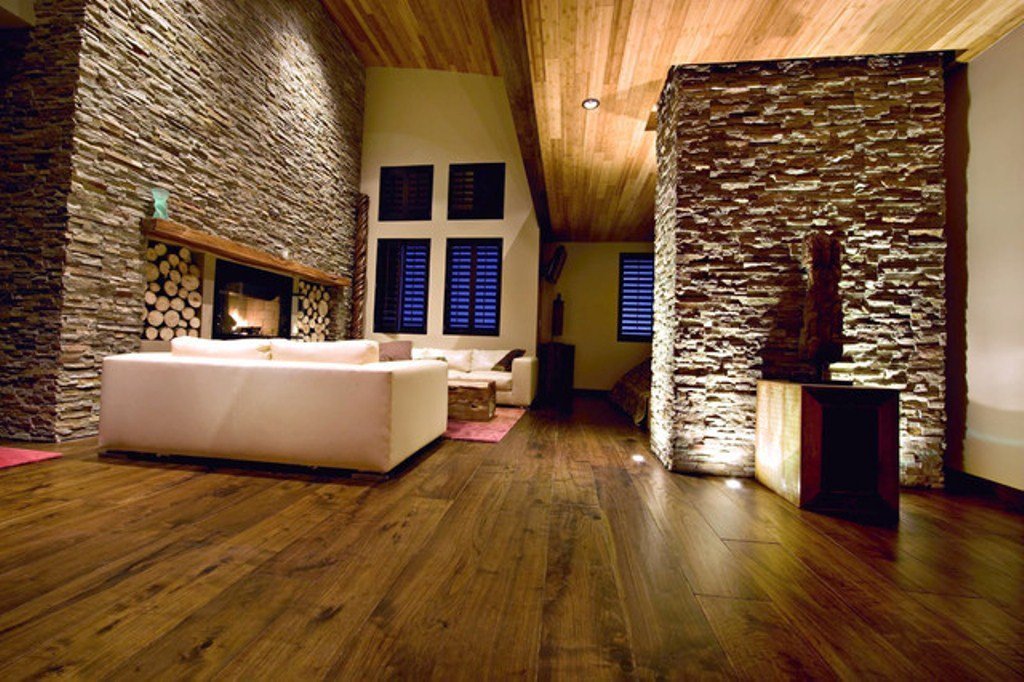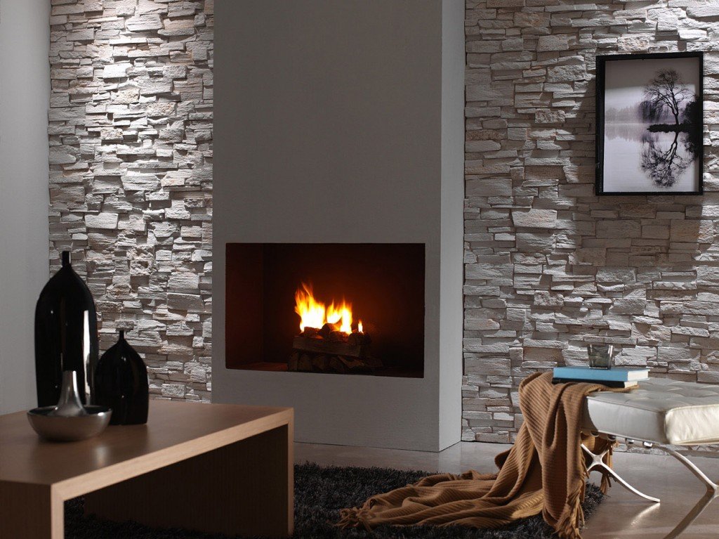 El revestimiento con piedra decorativa es costoso, requiere la participación de apiladores profesionales en el proceso. El material es duradero, fuerte y natural, capaz de enfatizar la representatividad del propietario. Para que la decoración no se vea sombría, necesitará suficiente iluminación lateral y superior o alternar la mampostería con áreas enlucidas claras. Con la ayuda de la piedra, se lleva a cabo la decoración de acuarios, fuentes, áreas de paisajismo y puertas. Para simular rocas y bloques enteros, se realiza un marco especial con moldura de piedra. La opción es relevante para habitaciones grandes, para habitaciones estrechas, generalmente no se recomienda la decoración de piedra (con la excepción del corredor).Para ahorrar dinero, puede recurrir a enfrentarse con una piedra artificial, tan natural como sea posible. Es más ligero y fácil de instalar, y se caracteriza por la presencia de todo tipo de colores y formas. La expresividad de la mampostería dará un revestimiento de acabado oscuro. Otro movimiento de diseño es resaltar el contorno con pigmentos de oro o bronce, iridiscentes cuando se exponen a la luz.