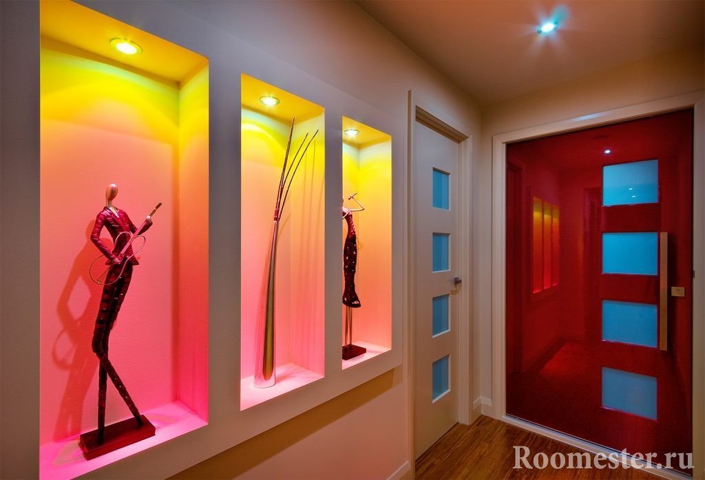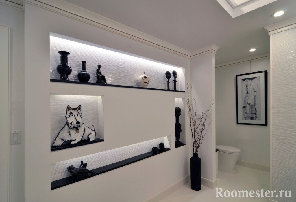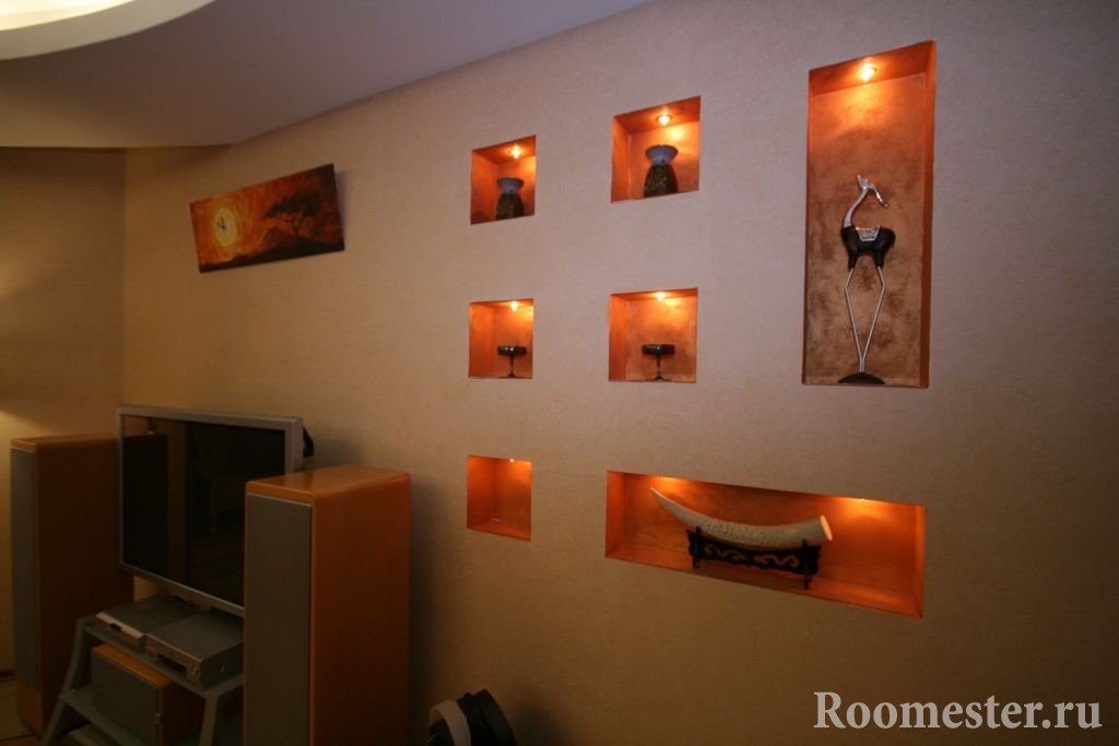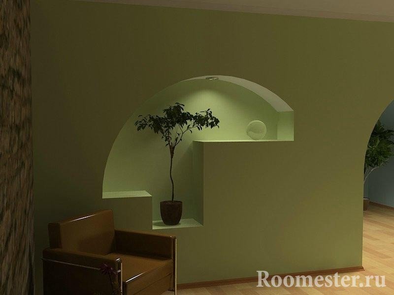 Las superestructuras funcionales de GKL pueden tener la forma de arcos, nichos y repisas para un acuario, televisión, refugio de comunicaciones. En este último caso, los diseños están equipados con escotillas ocultas. La pared falsa no tiene que ser sencilla; se permiten varias formas, curvas, caídas, estantes, pasos arqueados, estructuras auxiliares para unir accesorios. La salida de paredes falsas debe tener límites razonables, ya que en caso de espacio insuficiente puede verse feo. Los nichos pueden equiparse adicionalmente con puertas o cortinas con cerradura, lo que ayudará a ocultar los electrodomésticos. Un nicho de una sombra más saturada que el interior de todas las paredes de la sala de estar, por ejemplo, puede dividirlo visualmente en zonas. Triturar o complicar fragmentos de color no es deseable. Los tonos alternos pueden aumentar el espacio o hacerlo más compacto en apariencia.
