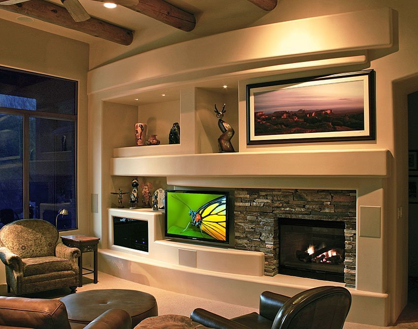Con un objeto funcional similar, puede organizar un hogar real. El diseño se ejecuta en varias direcciones estilísticas y actúa como el objeto central o de fondo de la sala de estar. En primer lugar, el grado de creatividad y el presupuesto en sí mismo afectan el resultado. La disposición externa del hogar no debe estar fuera del estilo de la habitación seleccionada, especialmente si actúa como un acento principal. La forma minimalista más común de enfrentar, porque encaja con éxito en cualquier arreglo. Classic se caracteriza por una versatilidad aún mayor y será relevante casi siempre.Los diseñadores a menudo ofrecen un estilo rústico para la propiedad de viviendas privadas, que incluyen revestimientos de piedra o ladrillo con madera en forma de paneles o listones. Se puede colocar una zona de TV completa sobre el hogar.