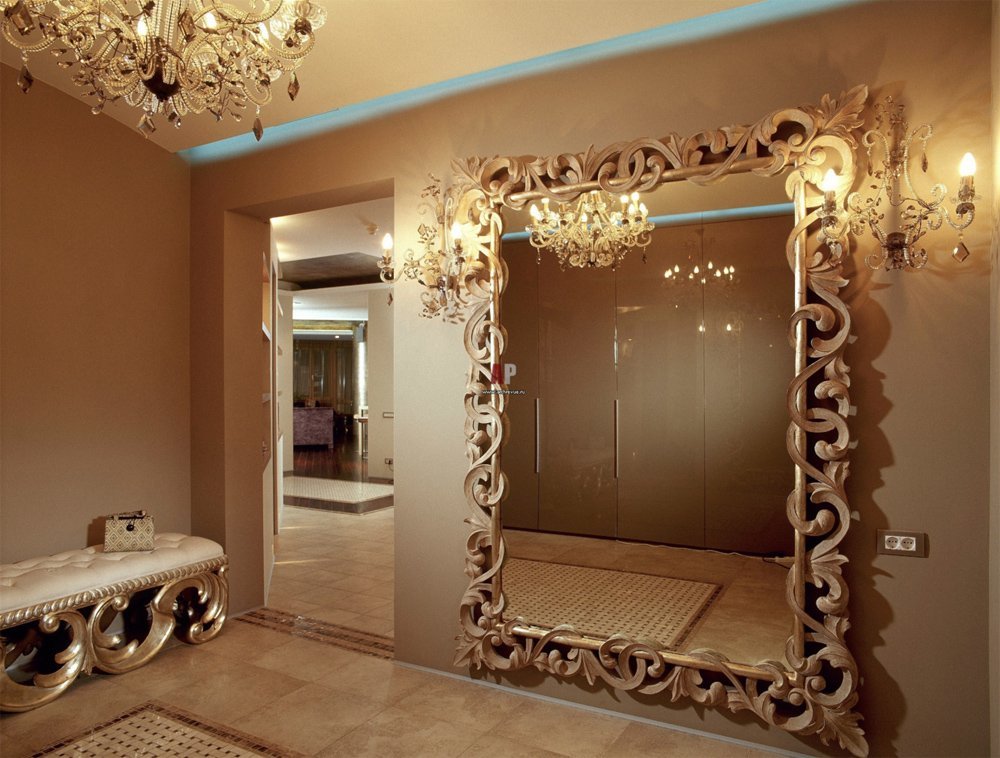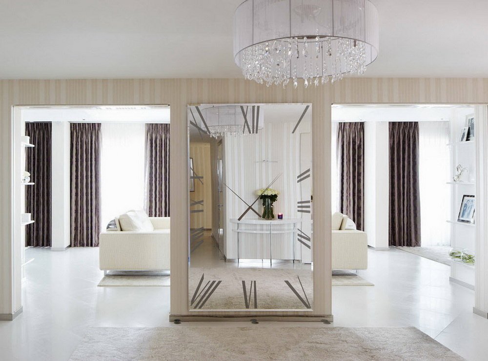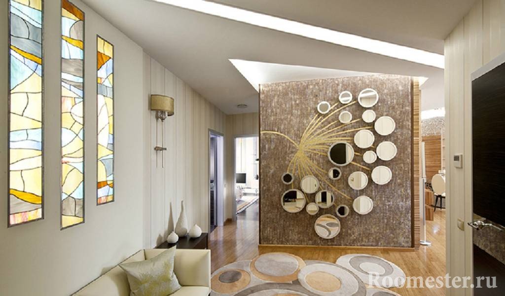Los paneles de vidrio pueden diferir en colores y texturas: están pegados a una película de color especial o pintura aplicada. La variedad de opciones le permite elegir el modelo correcto. Las estructuras de vidrio templado se pueden fijar sobre el vidrio previamente terminado, lo que crea un efecto 3D. Entre las ventajas están la ausencia de costuras debido a la integridad, resistencia a la humedad, ingenio de limpieza y alta resistencia. El aspecto original, la excelente iluminación y la amplitud le darán a la habitación un espejo. Es importante que el marco cumpla con el estilo elegido, por ejemplo, el metal es relevante para la alta tecnología. Puede colocar mosaicos de espejo o hacer una superficie de espejo sólida.Desde varias piezas de espejos con geometría pronunciada (ovalada, rectangular, etc.) puede ensamblar un panel espectacular. La frialdad de un espejo grande se nivela fijándose encima de otro más pequeño, encerrado en un marco decorado interesante.