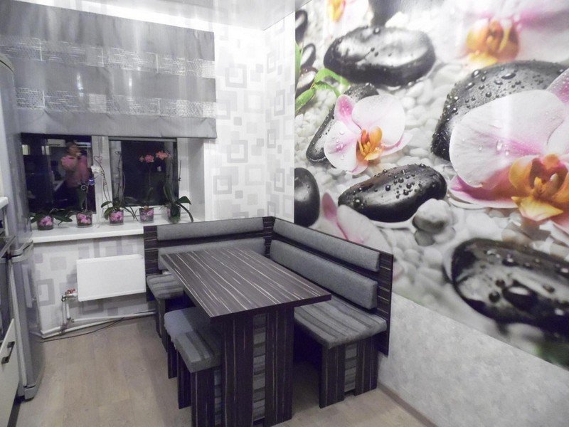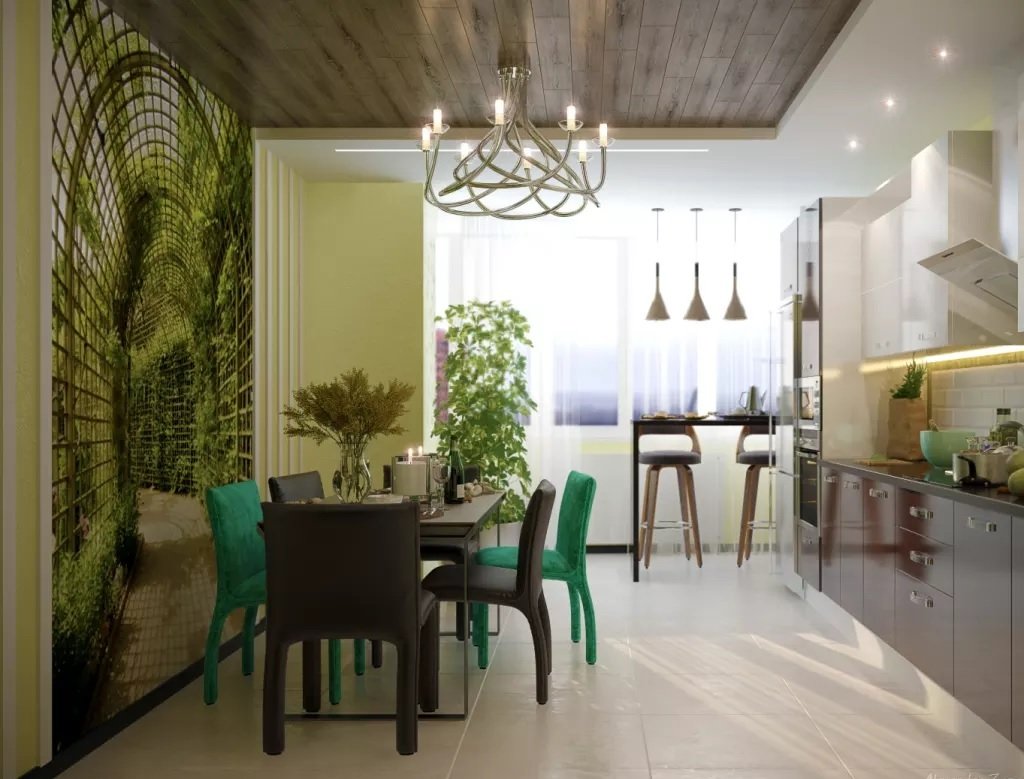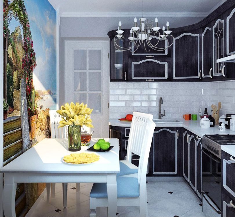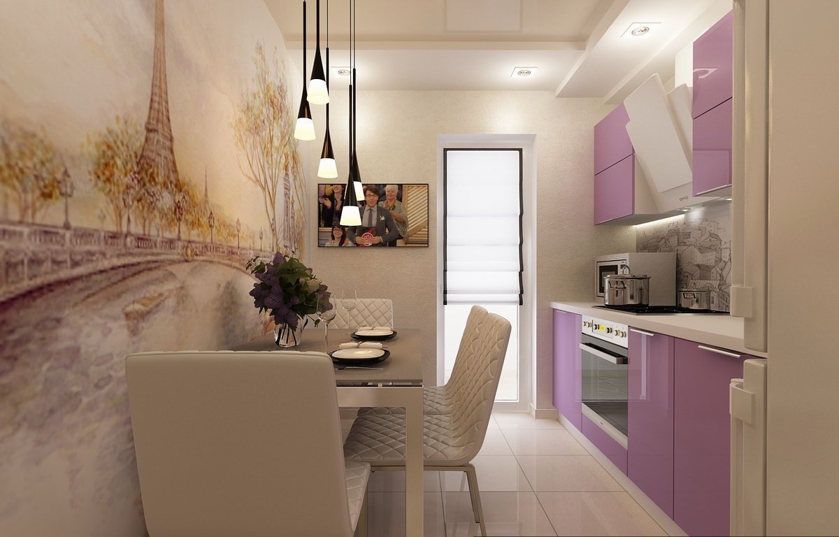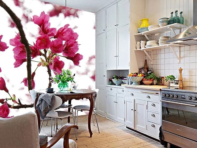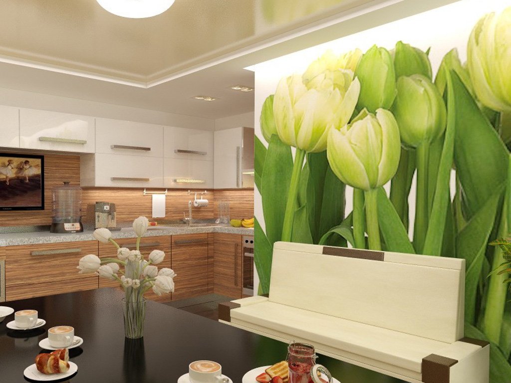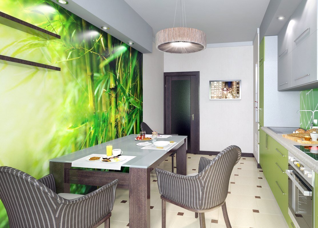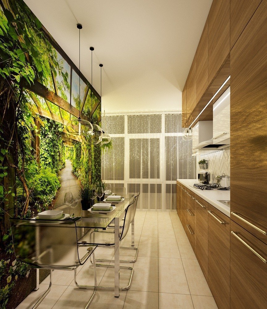 La forma real de agrandar visualmente una habitación estrecha es pegar con un pequeño mural de pared. Elija para imprimir deben ser dibujos claros y pastel con salpicaduras brillantes o sin ellos. El requisito principal es la selección de una imagen con un panorama, una vista de un área abierta, paisaje. La imagen con hierba baja en la bruma anterior al amanecer, imágenes con flores, un dibujo de una fuente de la ciudad en la plaza son excelentes opciones para crear un ambiente competente. Es importante tener en cuenta que los elementos altos a la izquierda y a la derecha, un marco arqueado con un diseño similar debe estar ausente. Conducirán a una reducción aún mayor en el espacio del piso. Si lo desea, las láminas con patrones similares también se pueden pegar a la pared "larga" ubicada frente a la zona de cocción. Antes de la decoración personalizada, se recomienda colocar el grupo de comedor original: una mesa redonda o cuadrada, 2-4 sillas.