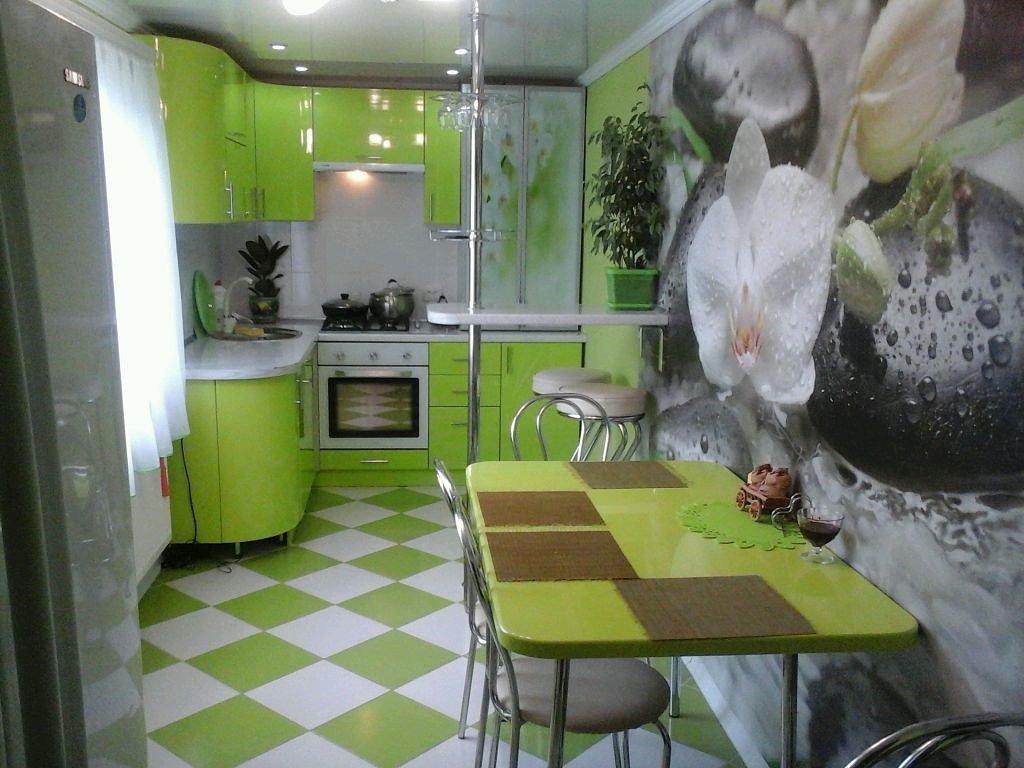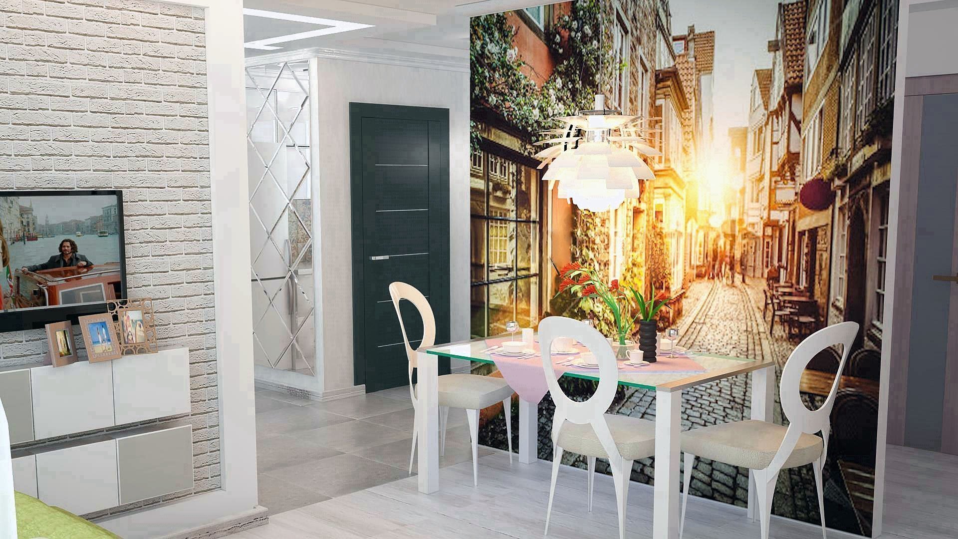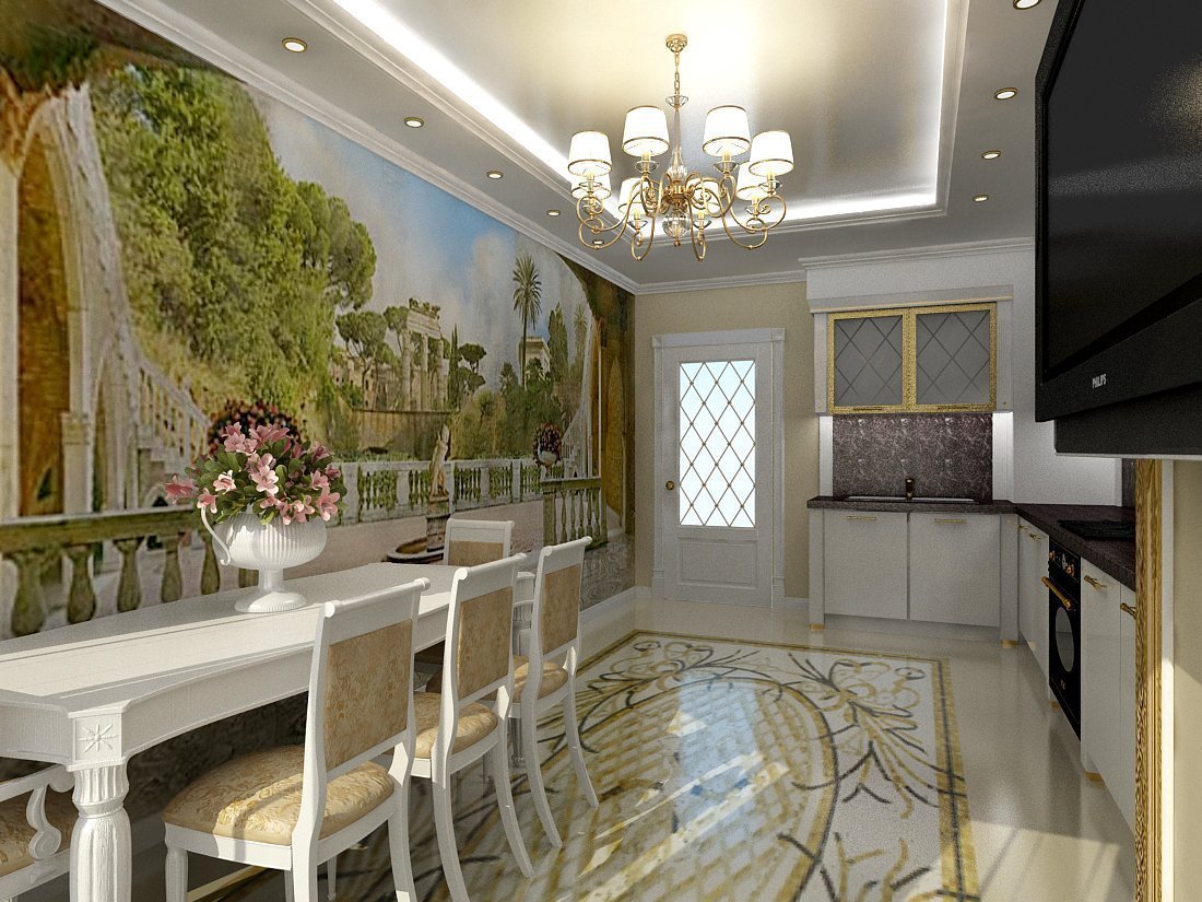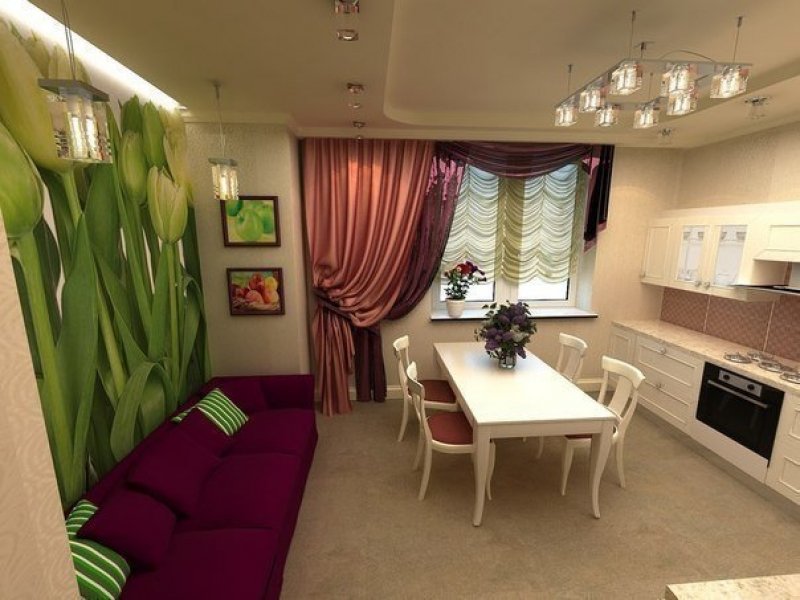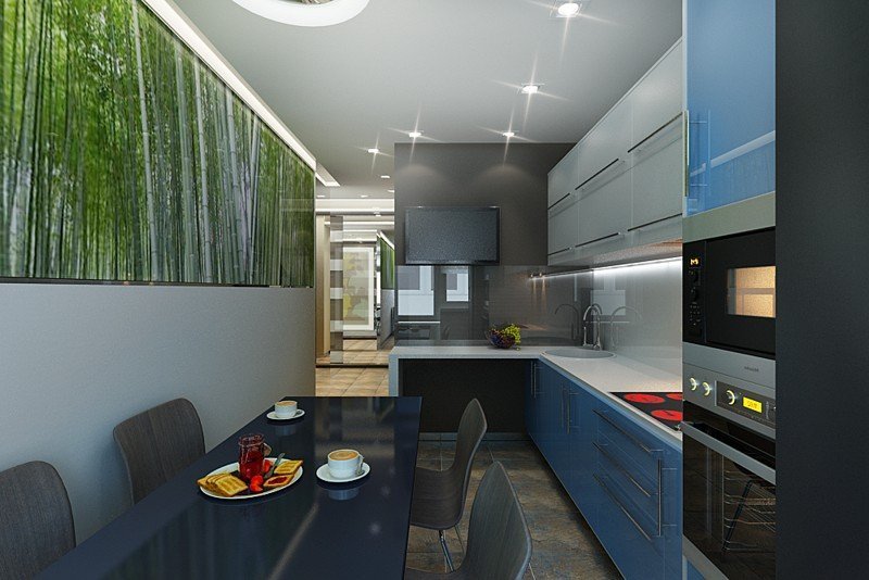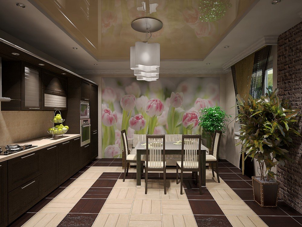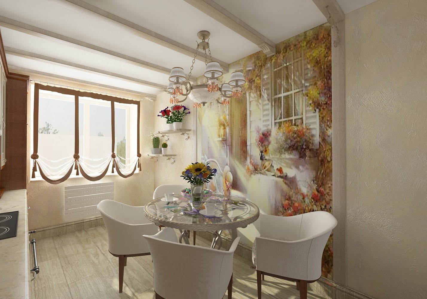 La forma real de agrandar visualmente una habitación estrecha es pegar con un pequeño mural de pared. Elija para imprimir deben ser dibujos claros y pastel con salpicaduras brillantes o sin ellos. El requisito principal es la selección de una imagen con un panorama, una vista de un área abierta, paisaje. La imagen con hierba baja en la bruma anterior al amanecer, imágenes con flores, un dibujo de una fuente de la ciudad en la plaza son excelentes opciones para crear un ambiente competente. Es importante tener en cuenta que los elementos altos a la izquierda y a la derecha, un marco arqueado con un diseño similar debe estar ausente. Conducirán a una reducción aún mayor en el espacio del piso. Si lo desea, las láminas con patrones similares también se pueden pegar a la pared "larga" ubicada frente a la zona de cocción. Antes de la decoración personalizada, se recomienda colocar el grupo de comedor original: una mesa redonda o cuadrada, 2-4 sillas.