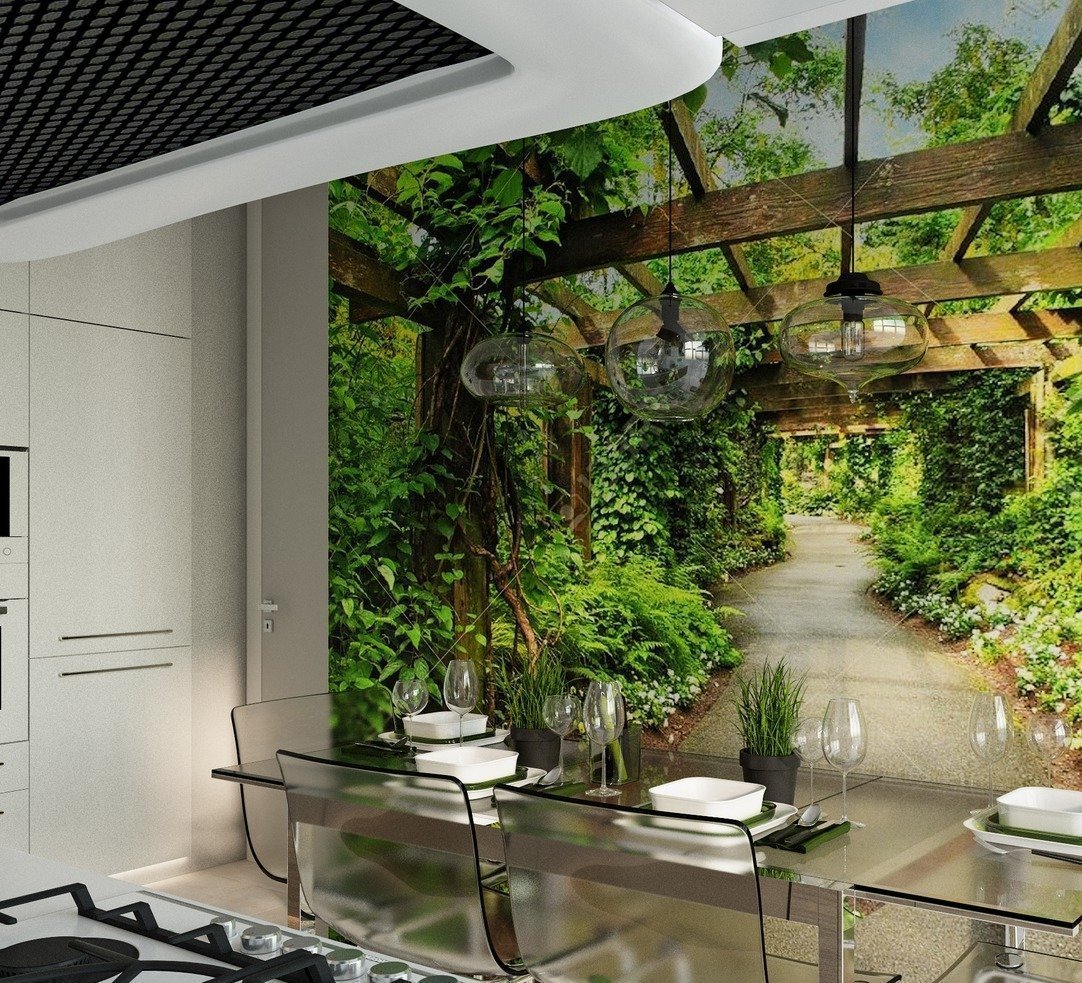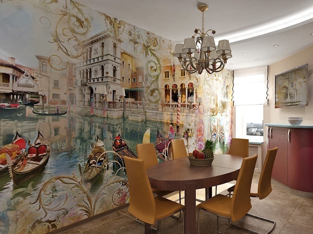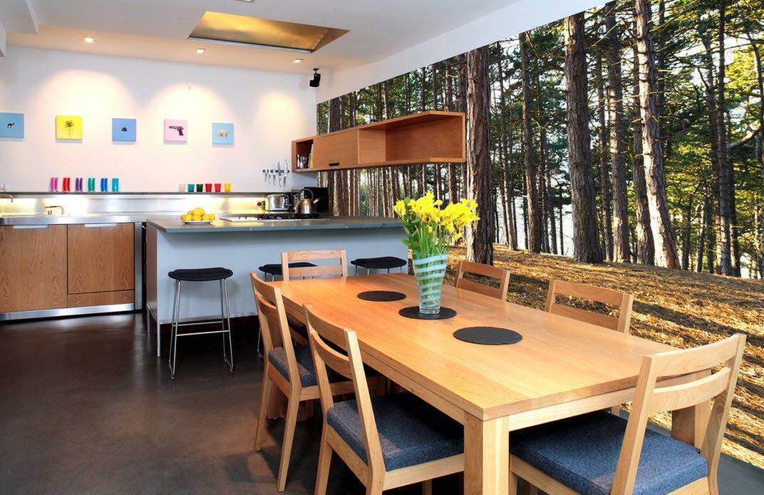Los murales hermosos y sofisticados en el interior de la cocina se ven mejor. Este tipo de decoración le permite aumentar visualmente el área de la habitación, elevar los techos y estilizarla rápidamente. El uso de ropa de cama está permitido para cocinas comunes y habitaciones combinadas con el salón. El único requisito es una selección cuidadosa de la imagen y el tipo de impresión apropiado. Dependiendo de la tecnología de transferencia del patrón, la base utilizada y la protección, la vida útil de los productos puede variar significativamente. Para decorar adecuadamente el apartamento y no preocuparse por la necesidad de reparaciones repetidas, debe estudiar todos los consejos y trucos para elegir las mejores pinturas. También debe seguir cuidadosamente las instrucciones para una gama, trama y tamaño óptimos del fondo de pantalla de la foto. Después de estudiar los consejos para elegir productos, los propietarios pueden encontrar fácil y fácilmente modelos hermosos y prácticos.