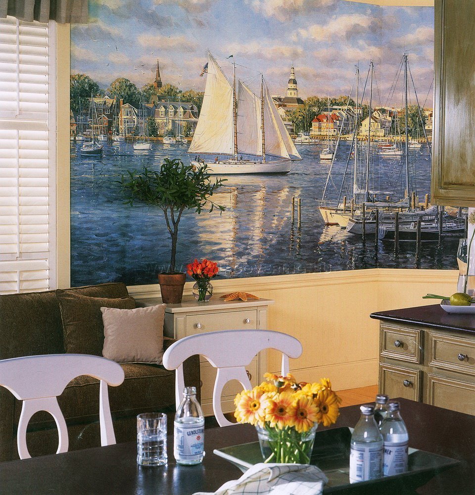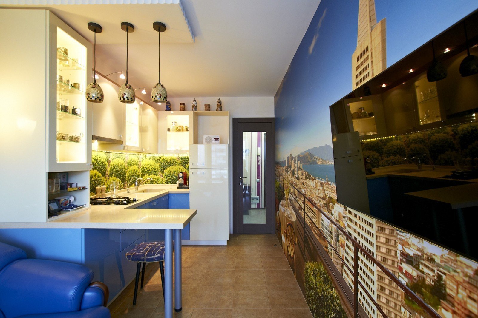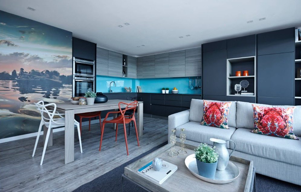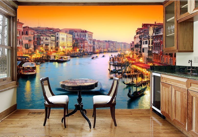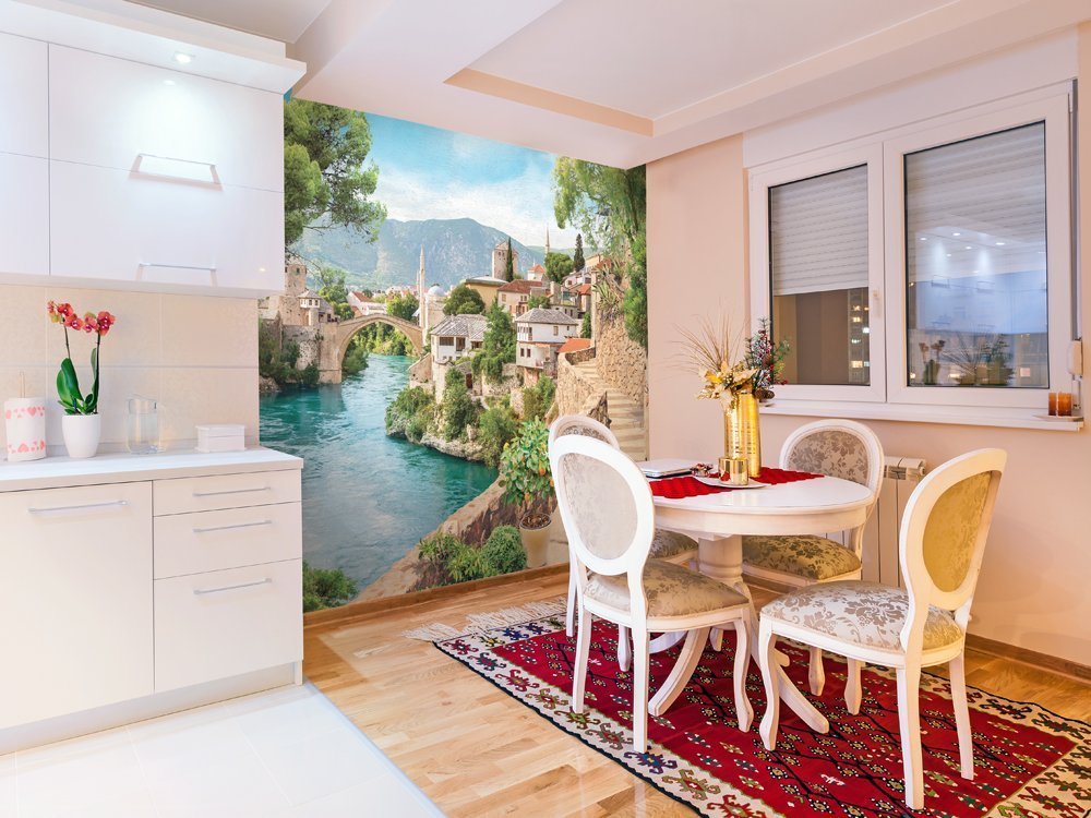 Para habitaciones pequeñas que necesitan expandirse visualmente, debe elegir un diagrama con objetos eliminados y que retroceden. Una vista del océano con un parapeto le permitirá recordar unas vacaciones deliciosas todos los días. Los murales de gran formato con la imagen de cañones, rocas junto al mar crearán una atmósfera tranquila y mesurada. La opción original será el río que conduce a la distancia y una vista desde el balcón de los campos italiano y francés. Pero el requisito principal para un aumento visual en la cocina será la elección de una imagen en colores brillantes. Es él quien ampliará su área sin recurrir a la revisión.