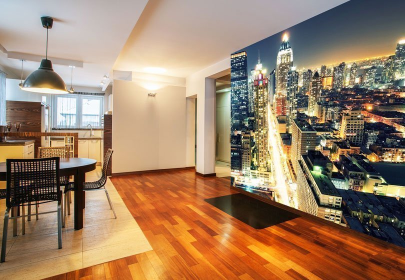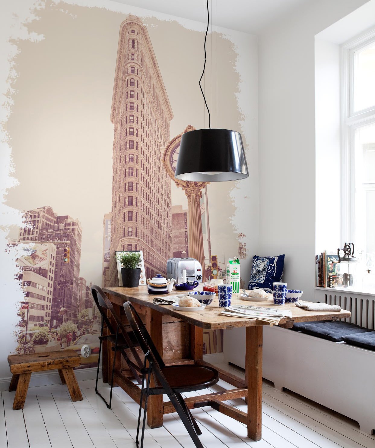 El papel tapiz fotográfico brillante, claro o monocromático se puede utilizar en habitaciones de diferentes tamaños, donde se realizan comidas y comidas. Pero la principal ventaja de este acabado no es la posibilidad de un estilo fácil, sino su versatilidad. Son perfectos para una pequeña cocina y un amplio comedor. Otros beneficios de los materiales de impresión fotográfica inusuales incluyen: