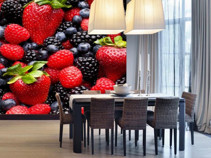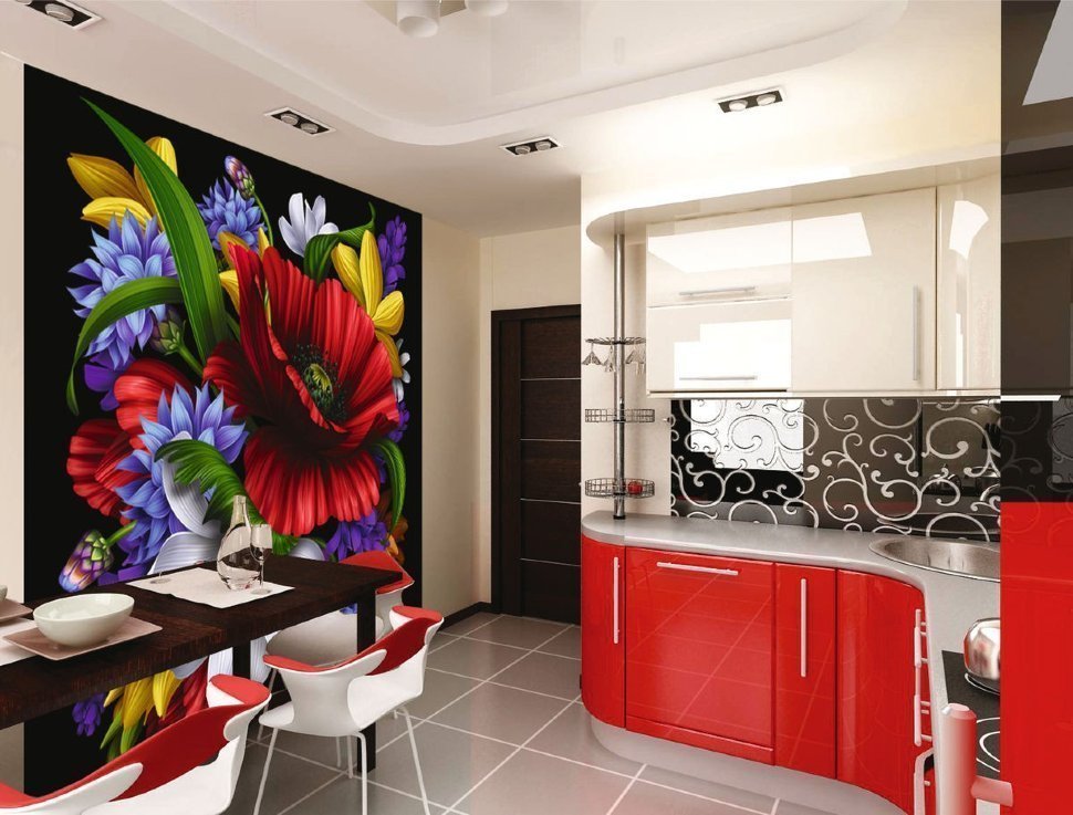 Jugar con contrastes pegando una de las paredes de la cocina con un acabado inusual con la impresión de fotografías es una decisión equivocada. Después de todo, el papel tapiz fotográfico elegido debe complementar armoniosamente el resto de los materiales de diseño. Se recomienda utilizar la decoración en habitaciones monocromáticas en tonos gris azulado, gris-blanco. Enfatizar la sofisticación de la situación ayudará a la iluminación adicional del lienzo. Las luminarias deben colocarse de tal manera que no se destaquen las juntas ni las costuras de la conexión de las partes individuales de la imagen ensamblada. Una imagen sepia también es adecuada para una habitación monocromática: los cálidos tonos marrón-negro crearán un ambiente especial. Para habitaciones luminosas, es mucho más fácil elegir el patrón óptimo para el lienzo con la impresión de fotografías. Los tonos rojos predominantes de la decoración (paneles de delantal de plástico, cocina) complementarán el lienzo con un fondo blanco o gris claro y grandes bayas rojas o inflorescencias. Para otros colores, elija un acabado de acuerdo con el mismo principio.