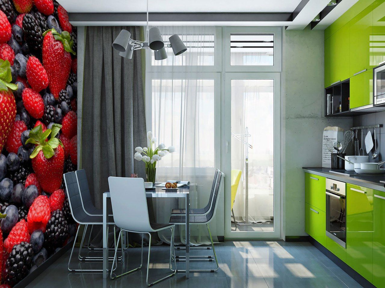 Los límites de una habitación pequeña se separan mediante imágenes hechas en tonos fríos: lila, azul, verdoso. Tales colores atenúan la sensación de hambre, lo cual es importante para las personas que controlan la cantidad de alimentos consumidos.