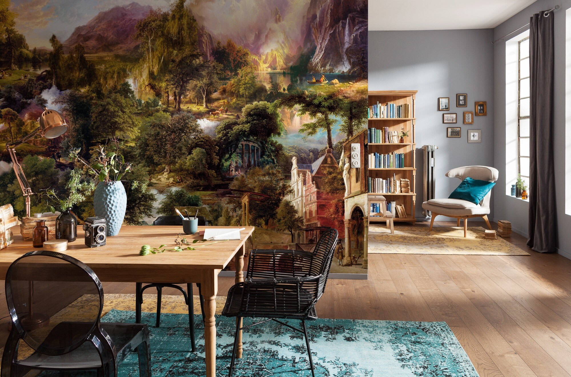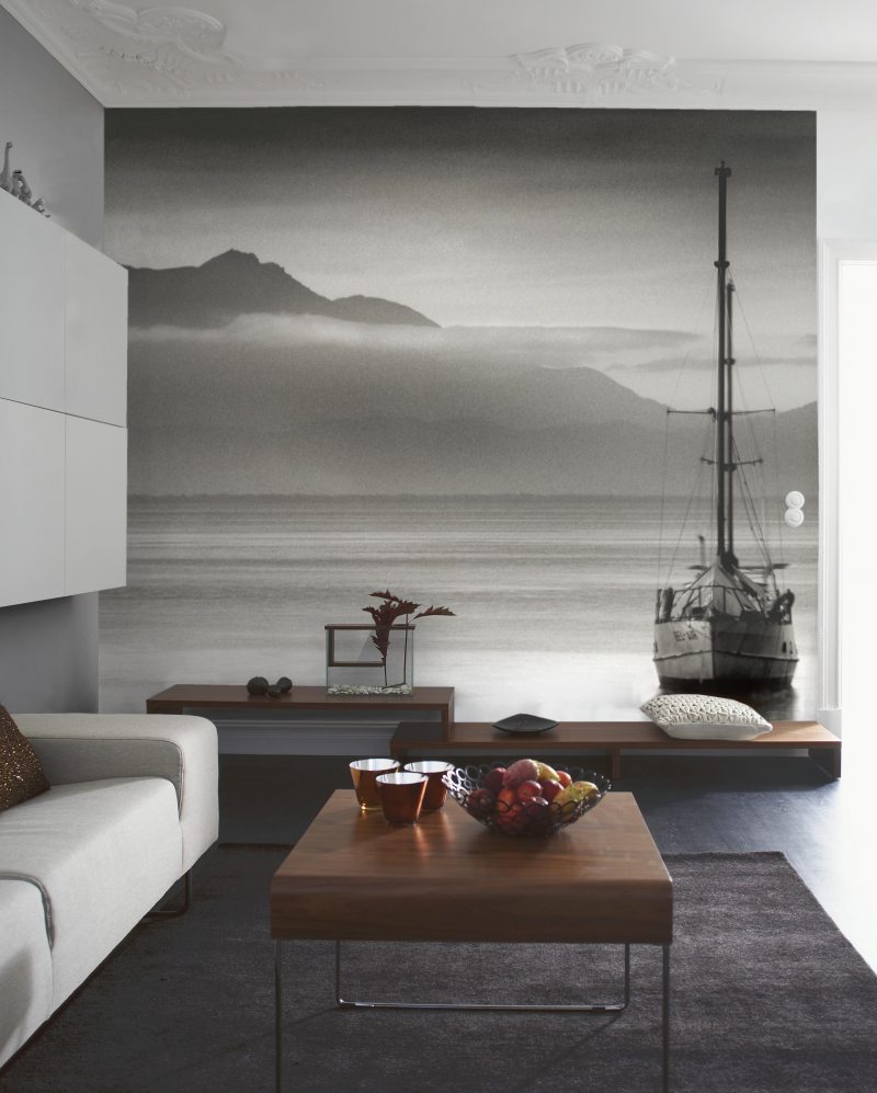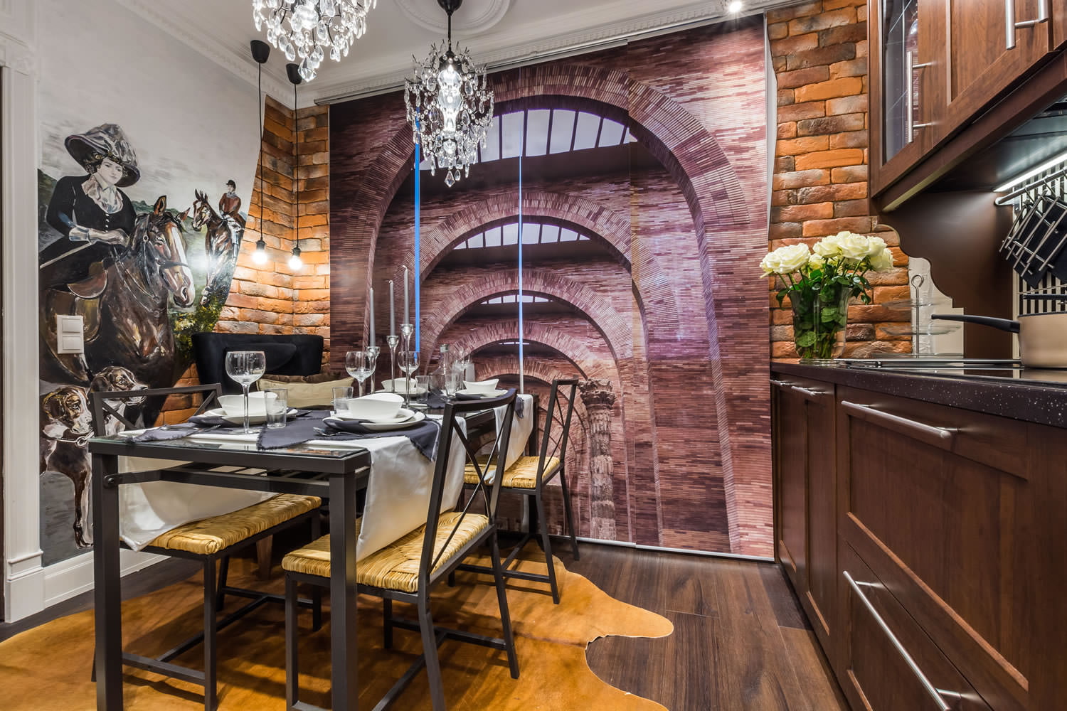 La colocación panorámica de la imagen le permite crear el efecto de presencia en el momento, sumergirse en el espacio. Le permite empujar los límites de las habitaciones pequeñas tanto como sea posible, sumergirse en un ambiente fantástico. La pared pegada acentúa toda la atención de las personas a su alrededor.