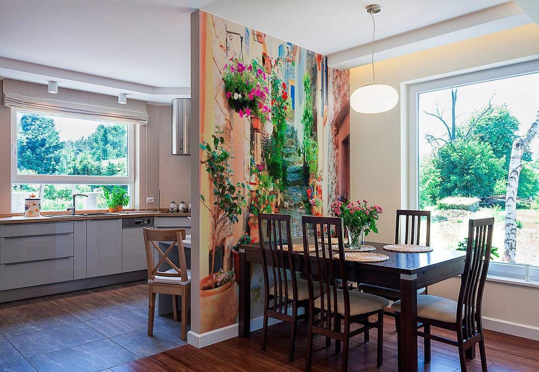 Los materiales y las tecnologías que se utilizan para crear un papel tapiz fotográfico moderno le permiten utilizar este material en el diseño de habitaciones húmedas, en las que son posibles las diferencias de temperatura. Es por eso que se hizo posible usar papel tapiz fotográfico en el diseño de la cocina, aunque aquí se usan con mucha menos frecuencia que en otras habitaciones. En la cocina, debe dar preferencia a las opciones de papel tapiz de vinilo o no tejido.Se adhieren bien a la superficie de la base, sirven mucho más tiempo, no permiten que la humedad y las manchas penetren profundamente en el material. La capa superior repelente al agua le permite lavar tales papeles pintados en cualquier momento sin ninguna consecuencia para la integridad del material. Las telas no se desvanecen bajo la influencia de los rayos ultravioleta y no sufren exposición a altas temperaturas. Muy a menudo, las imágenes se colocan en el área del comedor, llenándolas con toda la pared o solo una parte. También los murales pueden decorar el área del delantal sobre la superficie de trabajo. En este caso, la imagen debe protegerse con un delantal transparente de vidrio templado.