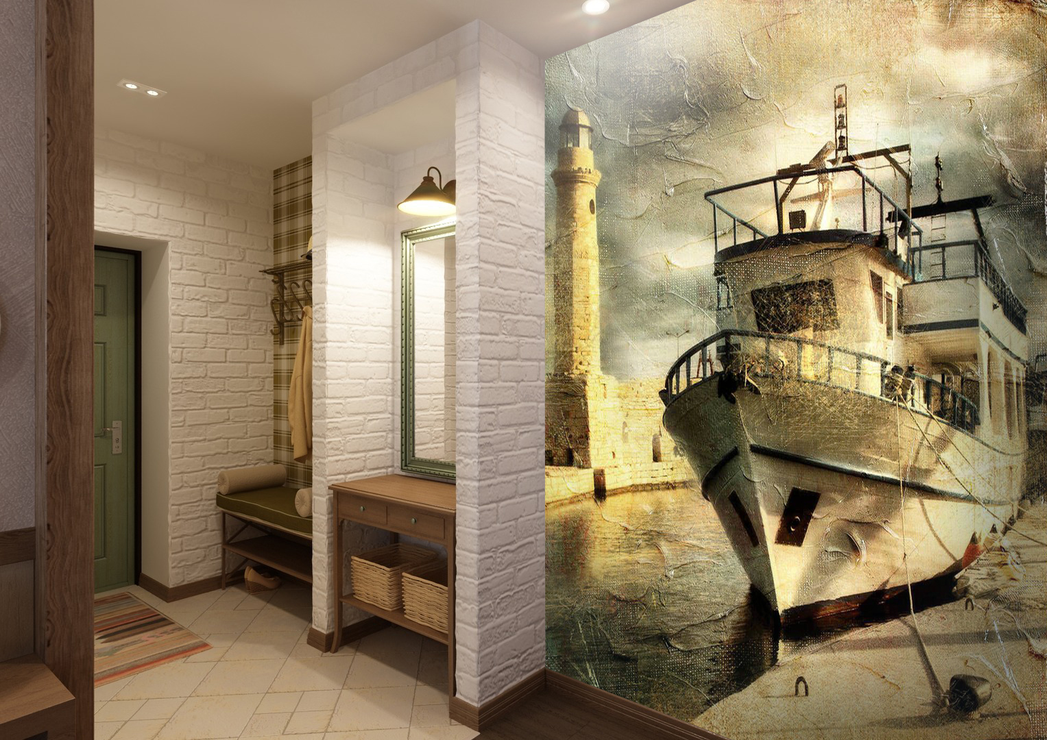 En el pasillo, los murales de pared realizan no solo una función decorativa. Con su ayuda, puede ajustar visualmente el espacio. Por ejemplo, empuje las paredes de un pasillo estrecho, cree la ilusión de espacio libre usando un papel tapiz con una perspectiva, o hágalo más cuadrado con el énfasis en una pared corta.