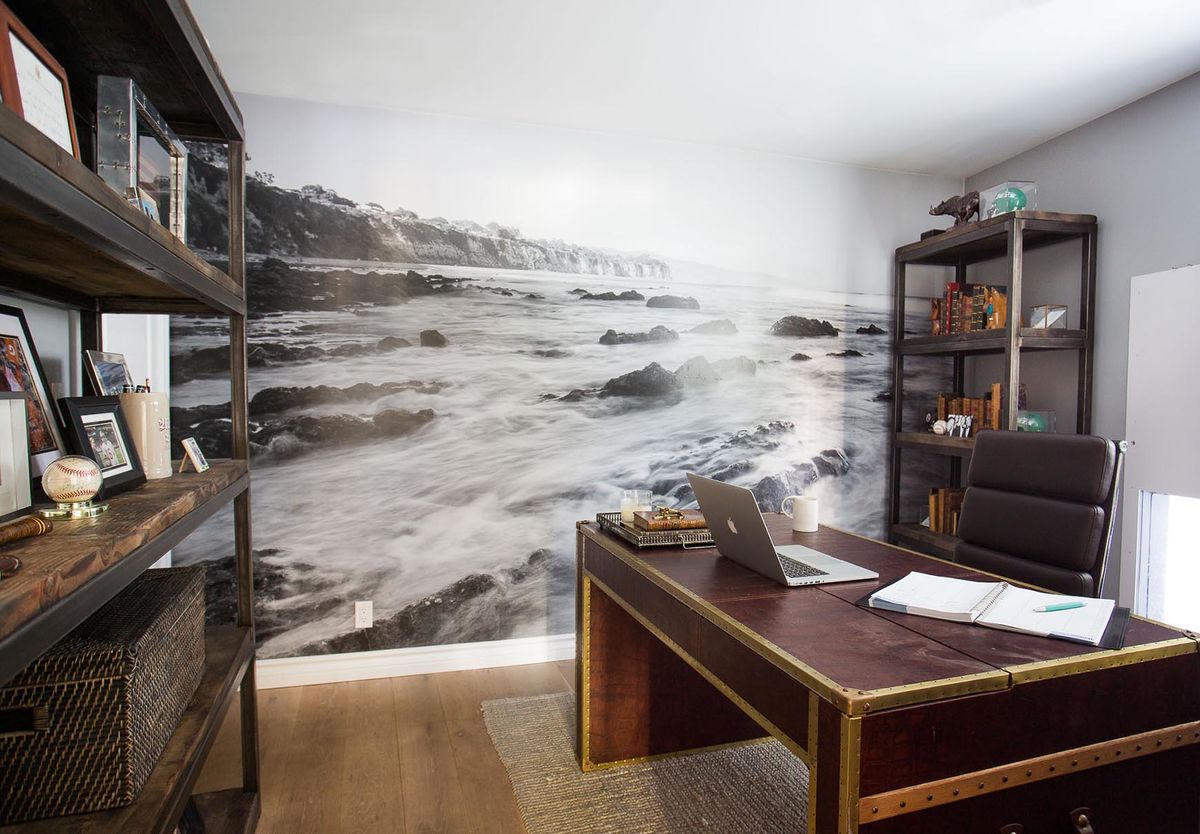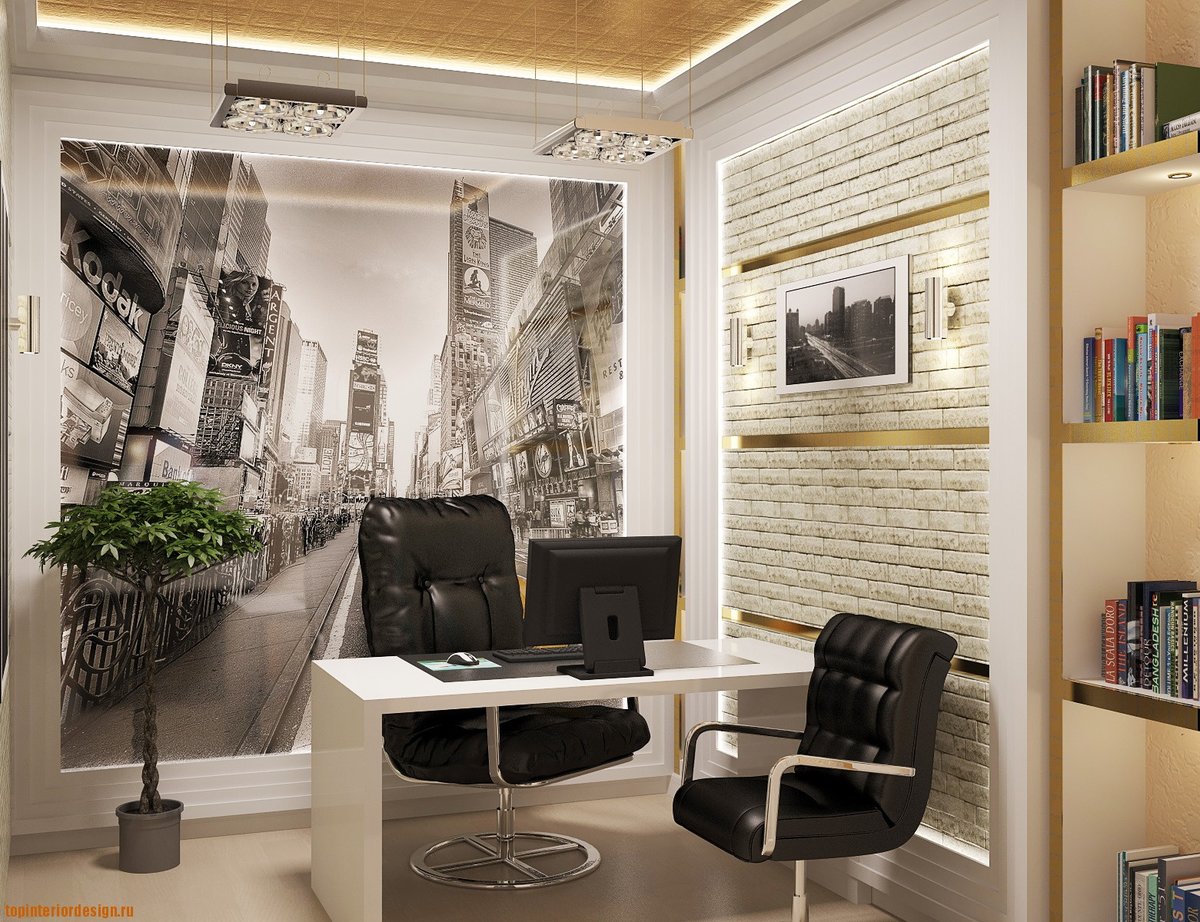 En la oficina puede encontrar un lugar para relajarse entre el trabajo.Para hacer esto, puede colocar una pequeña área de recreación aquí, pero, por el contrario, colocar una imagen atractiva con la imagen de un bosque o mar. En el área del escritorio, la imagen de un mapa geográfico, estanterías con folios o abstracción será más apropiada.