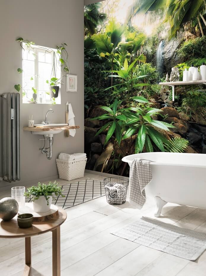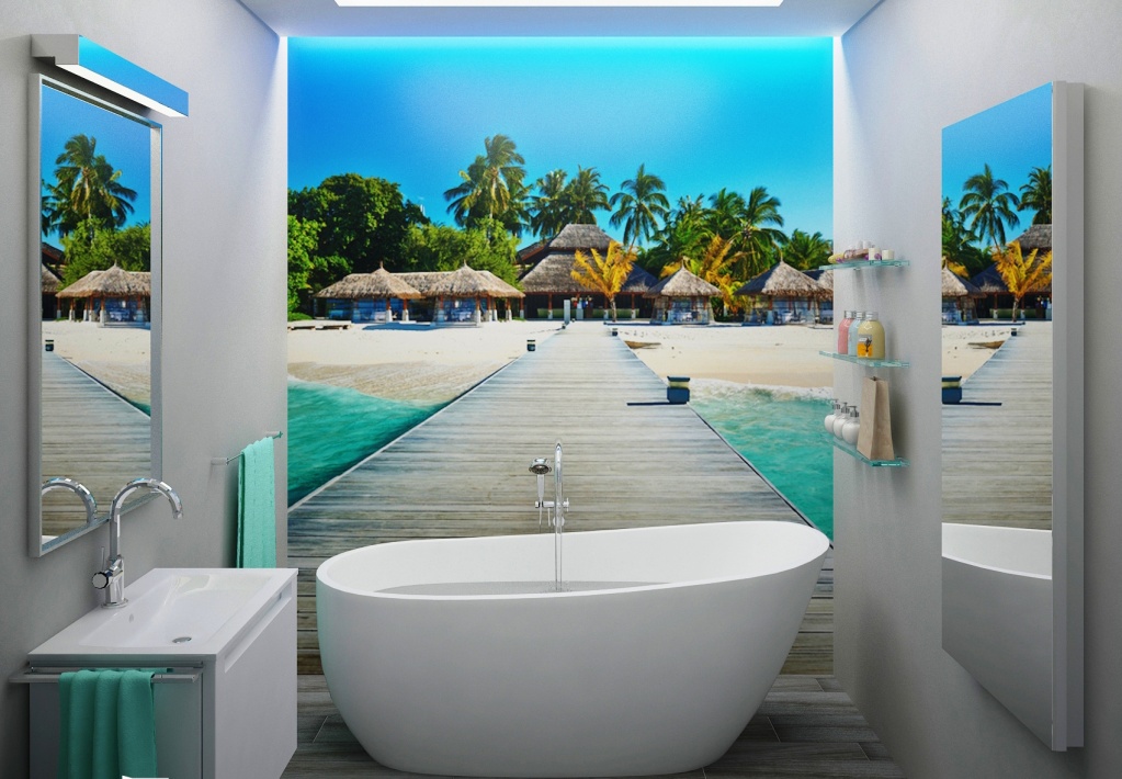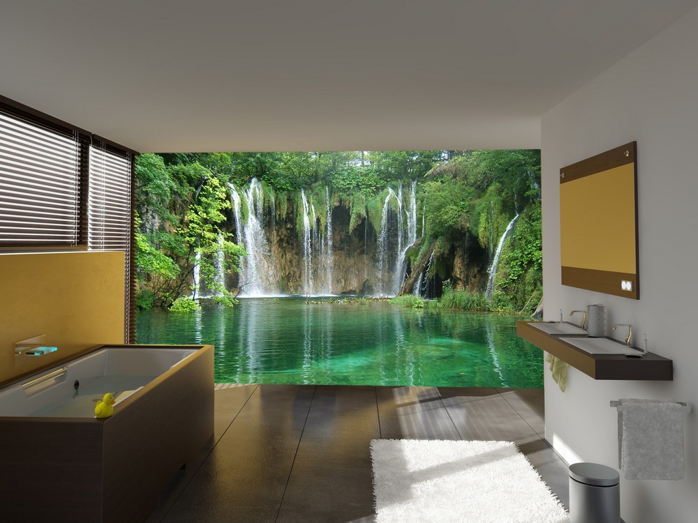 En el baño, es mejor abandonar el papel tapiz fotográfico y dar preferencia al mosaico con impresión fotográfica. Si la habitación es lo suficientemente grande, puede quitar debajo del panel de la pared la pared más alejada de las fuentes de agua. Entonces será posible no temer por la integridad del producto. Además, en el baño o en el baño, puede usar papel tapiz autoadhesivo. No están expuestos a la humedad. Los papeles pintados impermeables son tan apropiados en habitaciones húmedas como en cualquier otra habitación. Tienen una excelente protección contra el vapor caliente y la humedad.