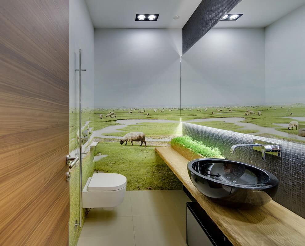 En el baño, es más práctico utilizar azulejos con impresión fotográfica. Cuanto más claro sea el esquema de color, más espaciosa aparecerá la habitación. Para hacer un baño más grande, ayude a la recepción con una imagen con perspectiva.