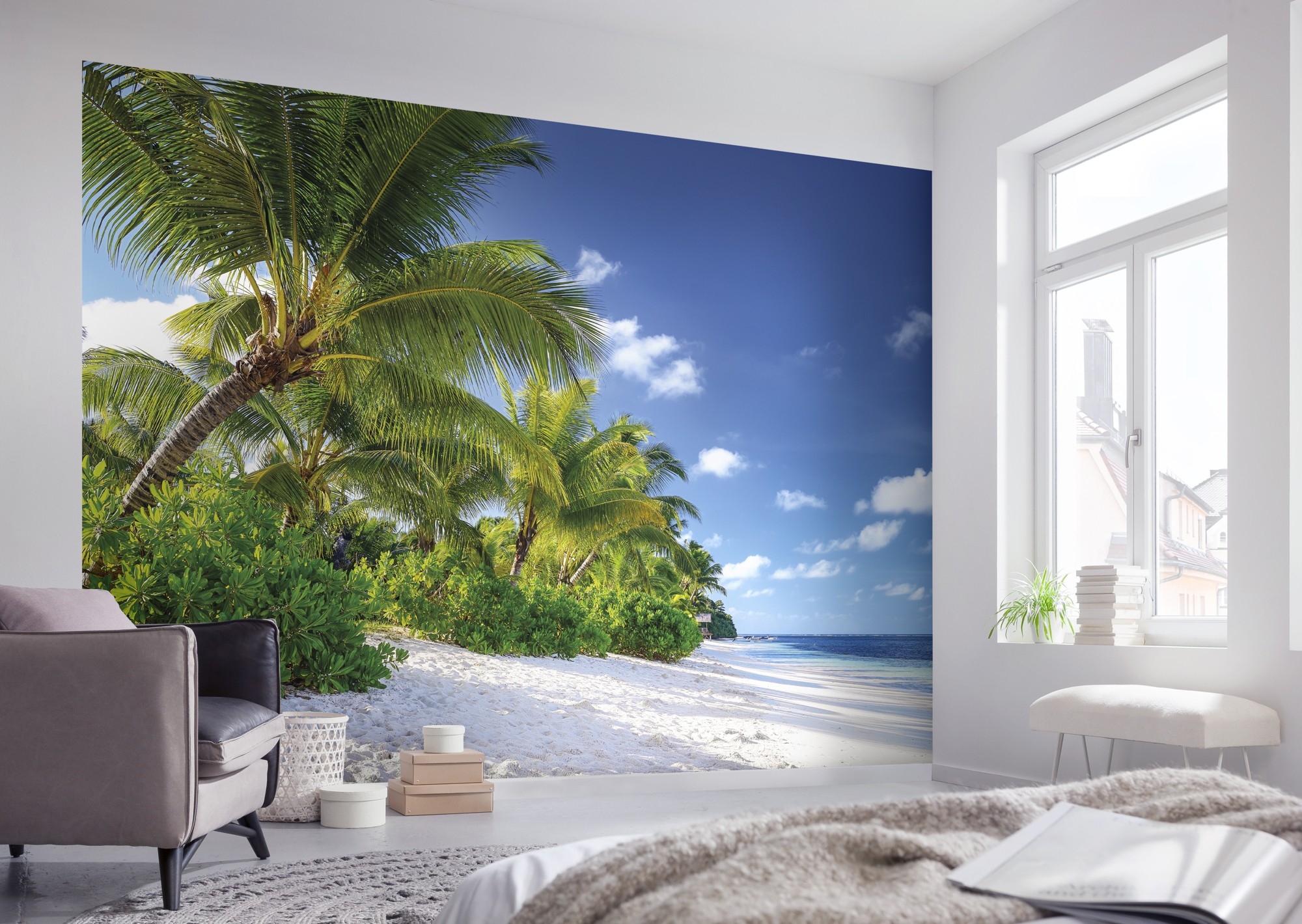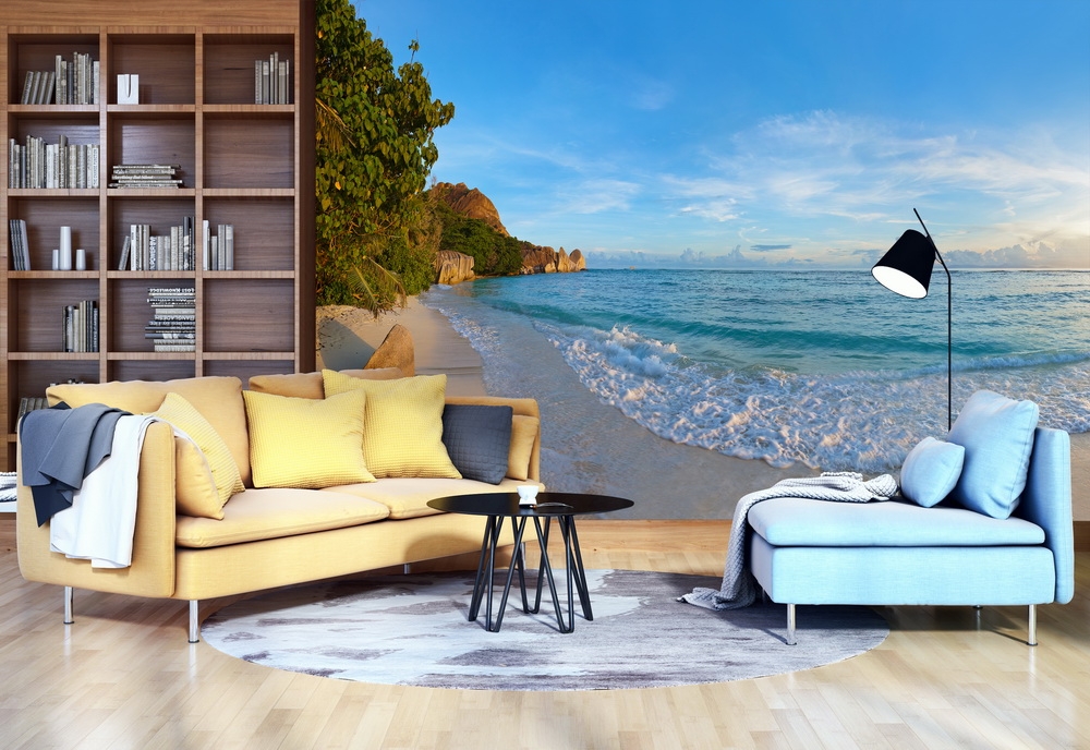 No menos importante es el color de los muebles. Contra el fondo de imágenes con vegetación tropical, un sofá blanco y una mesa de madera se verán idealmente. Los muebles de arena encajarán perfectamente en el tema marino.