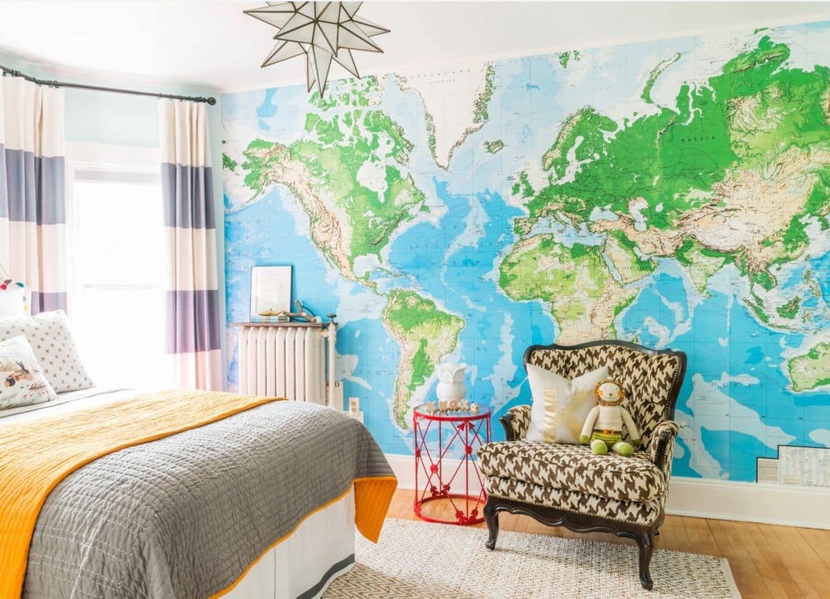 Los mapas geográficos se han utilizado durante mucho tiempo en el interior. Pero si antes solo se podían encontrar en una oficina o en una habitación para niños, ahora están presentes en salas de estar, dormitorios. Un mapa geográfico del mundo le permite crear un interior interesante no trivial.