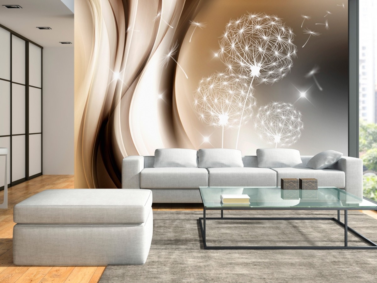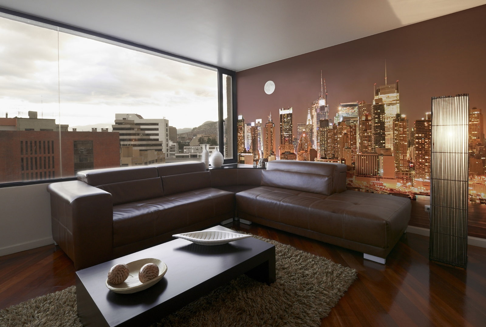 El salón es un lugar ideal en la casa donde se le permite encarnar las ideas más extrañas y no estándar. ¿Cuál es la mejor manera de colocar el mural en la sala de estar? Una gran opción sería decorar este material de pared, que tiene un grupo de sofás o una mesa de café. Por lo tanto, después de haberse establecido cómodamente después de un día duro en este acogedor lugar, será muy agradable observar hermosos paisajes o vistas de la ciudad nocturna.