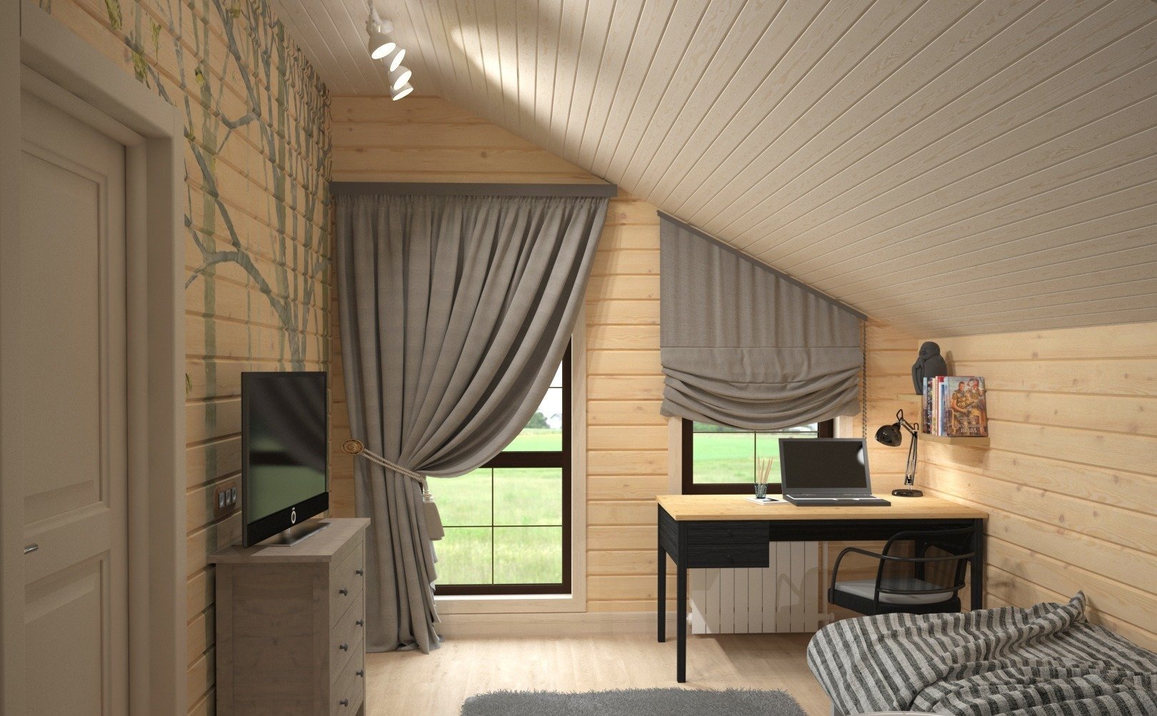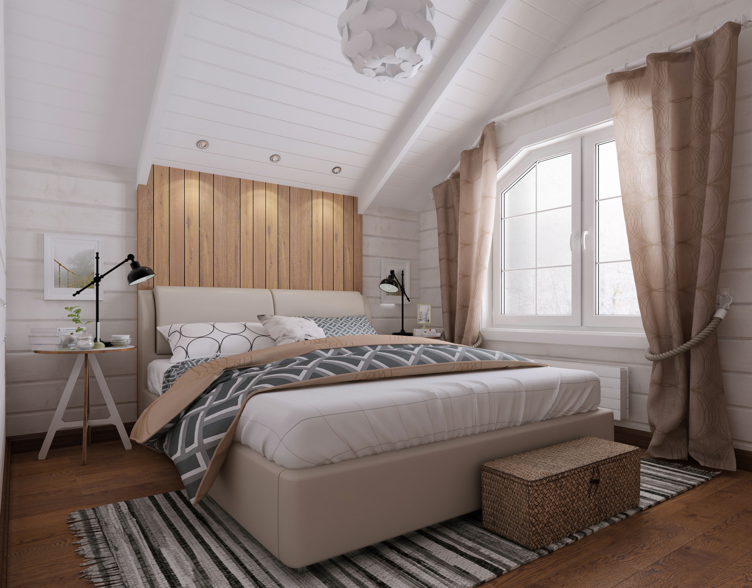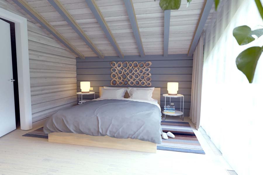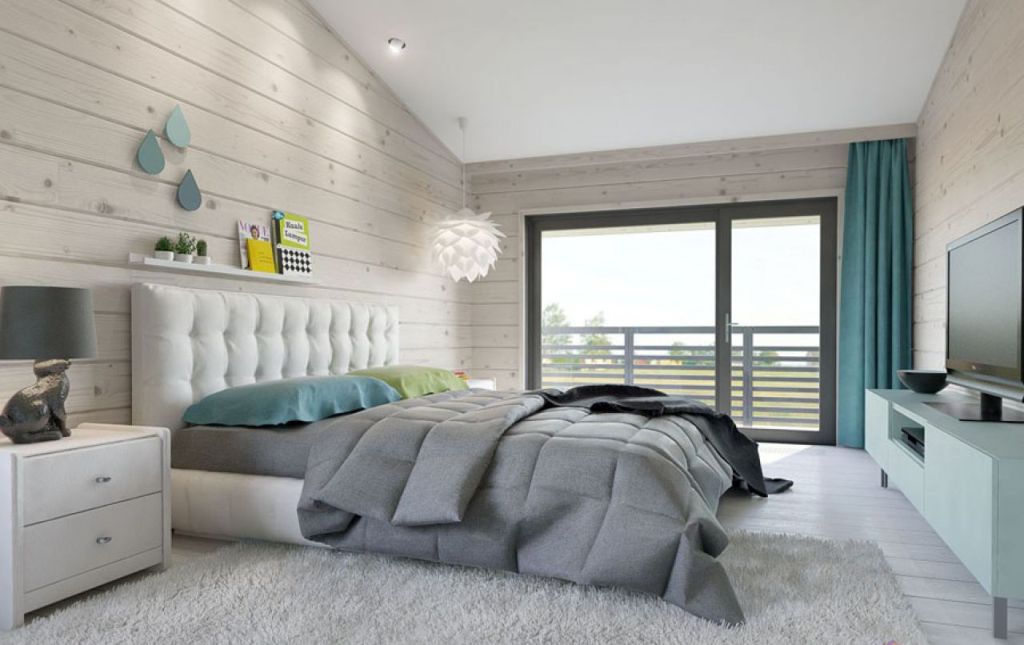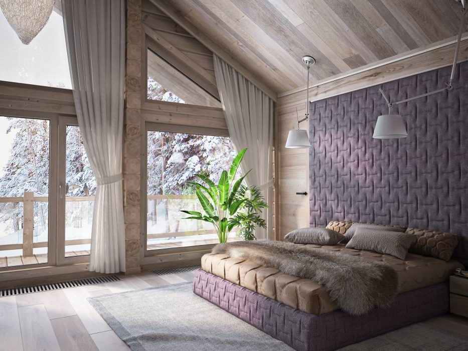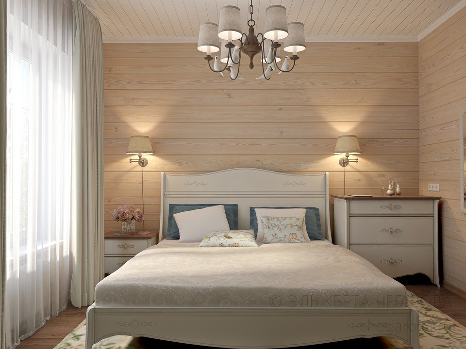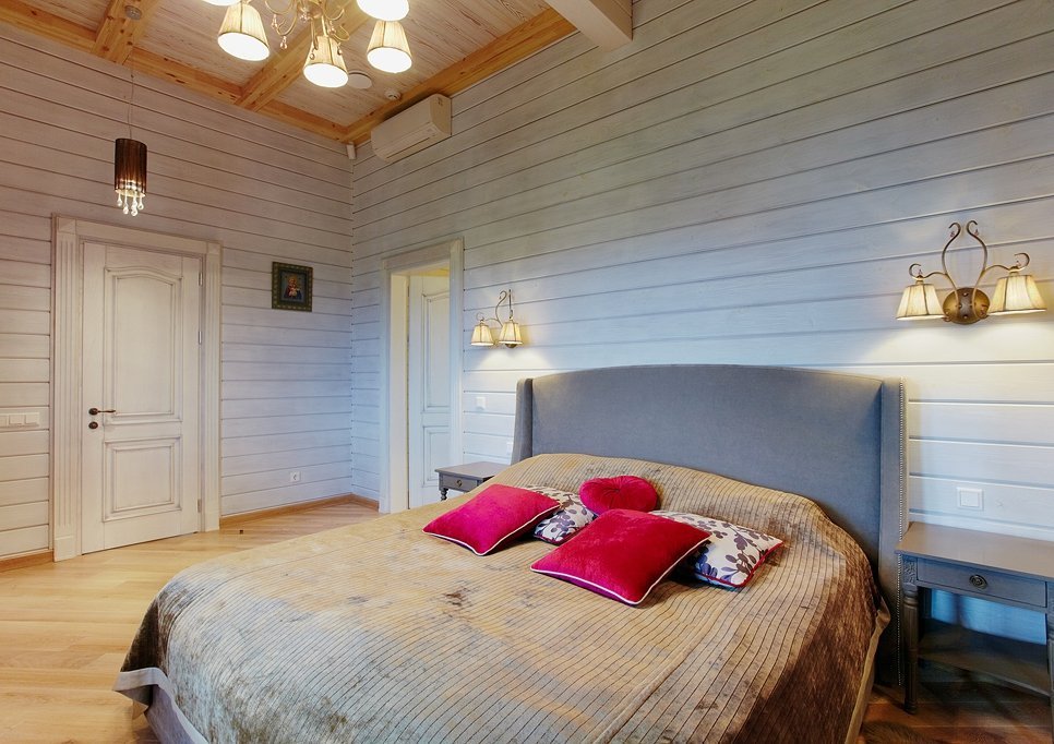 Para estilizar el dormitorio con la ayuda de la imitación del haz, se recomienda seleccionar materiales en colores neutros: beige, gris claro, crema claro o color pastel (oliva claro, lavanda, azul claro). El acabado directo se puede llevar a cabo de las siguientes maneras: